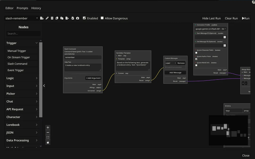 >>1391195 Меня никогда не перестанет удивлять каргокультистский дроч на ноды там где они реально хуёвый выбор. Они хороши когда у тебя есть DAG, в какой-нибудь звуко или видео обработке, в шейдерах, в общем ими заебись соединять всякие фильтры и рулить потоками данных. В текстовом РП и промптах у тебя есть циклы, переменные, даже самомодификация, как это всё нодами делать??? Тогда как банальный скрипт на JS или луа опишет это в пять строчек, не говоря уже о специализированных промпт-языках.