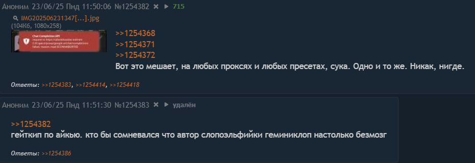 >>1391203 Так я спокойно написал что у меня проблемы с проксей, на что начались визги Жорика. Которые вылились во все последующее. Потом выяснилось что мой провайдер петуч из-за чего ни одна прокси без ВПН не работала.
