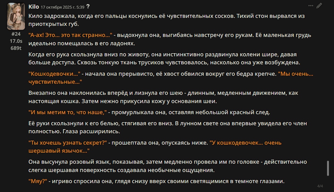 Попробовал промт на натурализм. Появляется больше будничных деталей, чары хотят пить, есть (сосёшся а у неё в животе урчит), просятся или уходят в туалет писить, секас с неуклюжими моментами итп. Наверняка можно и лучше, предлагайте/посоветуйте.