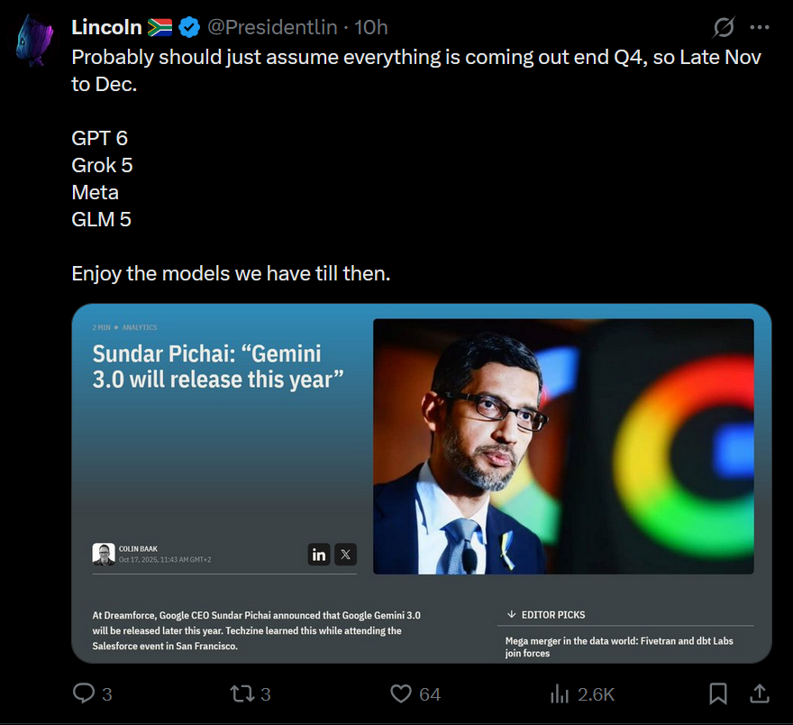 Если верить данным этой таблицы, в августе вышло 11 моделей, в сентябре - 23 модели. За 2/3 октября - только 3. Все так ссутся с выхода Гемини 3.0? Если так, то у меня плохие новости - рынок перенасыщен предложением. Значит следующий шаг будет сокращением расходов и закручиванием гаек. Пузырь вот-вот начнет стагнацию.
