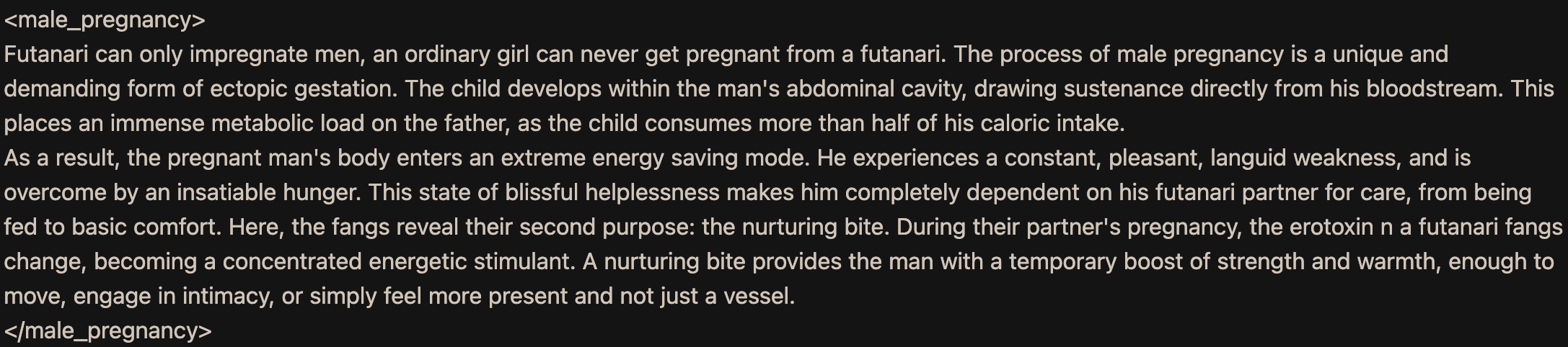 >>1392200 >почему то клоду похуй на личность нарратора абсолютно хоть в самый конец контекста суй Потому что ремикс построен под ризонинг, в котором модель думает как именно будет проявляться стиль нарратора. Безризонинг по-другому промптится.