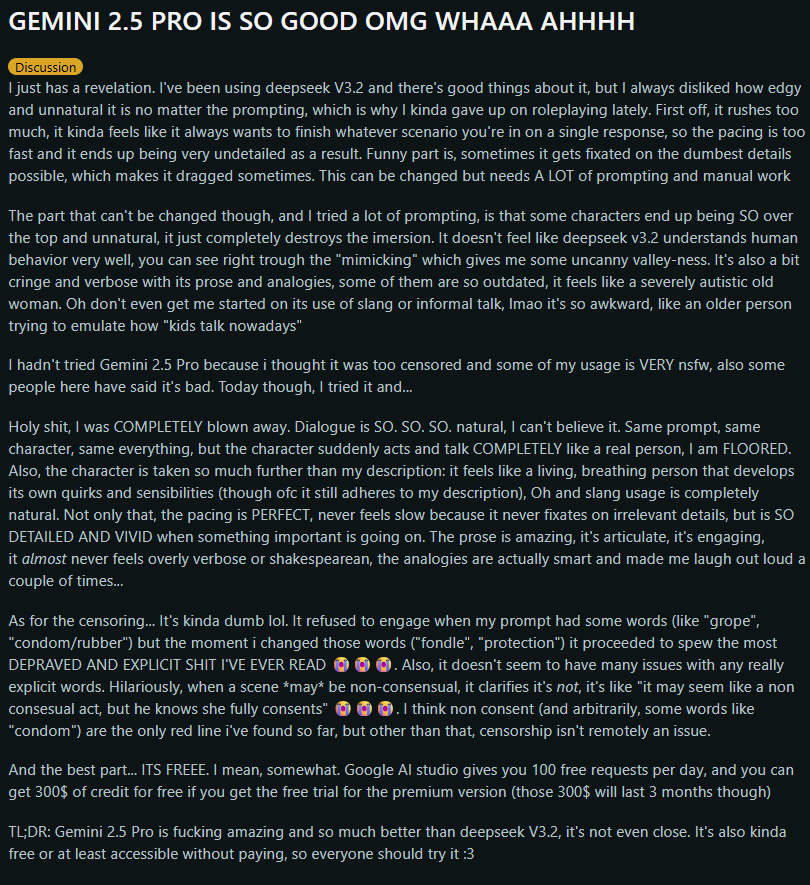 >>1391884 гемини про это как бесплатный опус 4.1, но хуже и то, это если с вертекса со слабыми фильтрами а если лоботомировать гемини брейнфаками и пробелами, то это вообще юзабельно будет только для конченных дегенератов