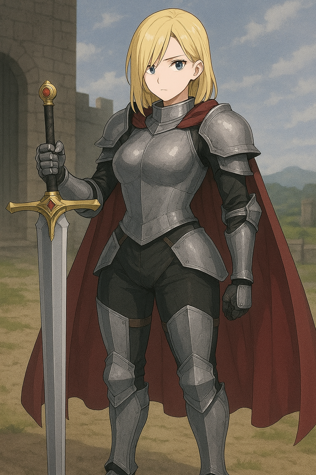 Knight: 5'7 ft tall, feminine figure, hourglass shape with E-Cup breasts, slim waist, wide hips, thick thighs, she's athletic due to her role as a knight. Golden blonde hair, bicep length, straight, the left half is pulled behind her ear, the right half is falling over her face. Bright blue eyes, thin brows, thick lashes, a mole under the left eye, no makeup. Full plate steel knight armor, with shoulder guards, full arm protections, gauntlets, breastplate that fits her generous chest, armor on the thighs, knees, ankles and foot, under the shoulder guards she wears a long crimson cape. Wields a custom zweihander.