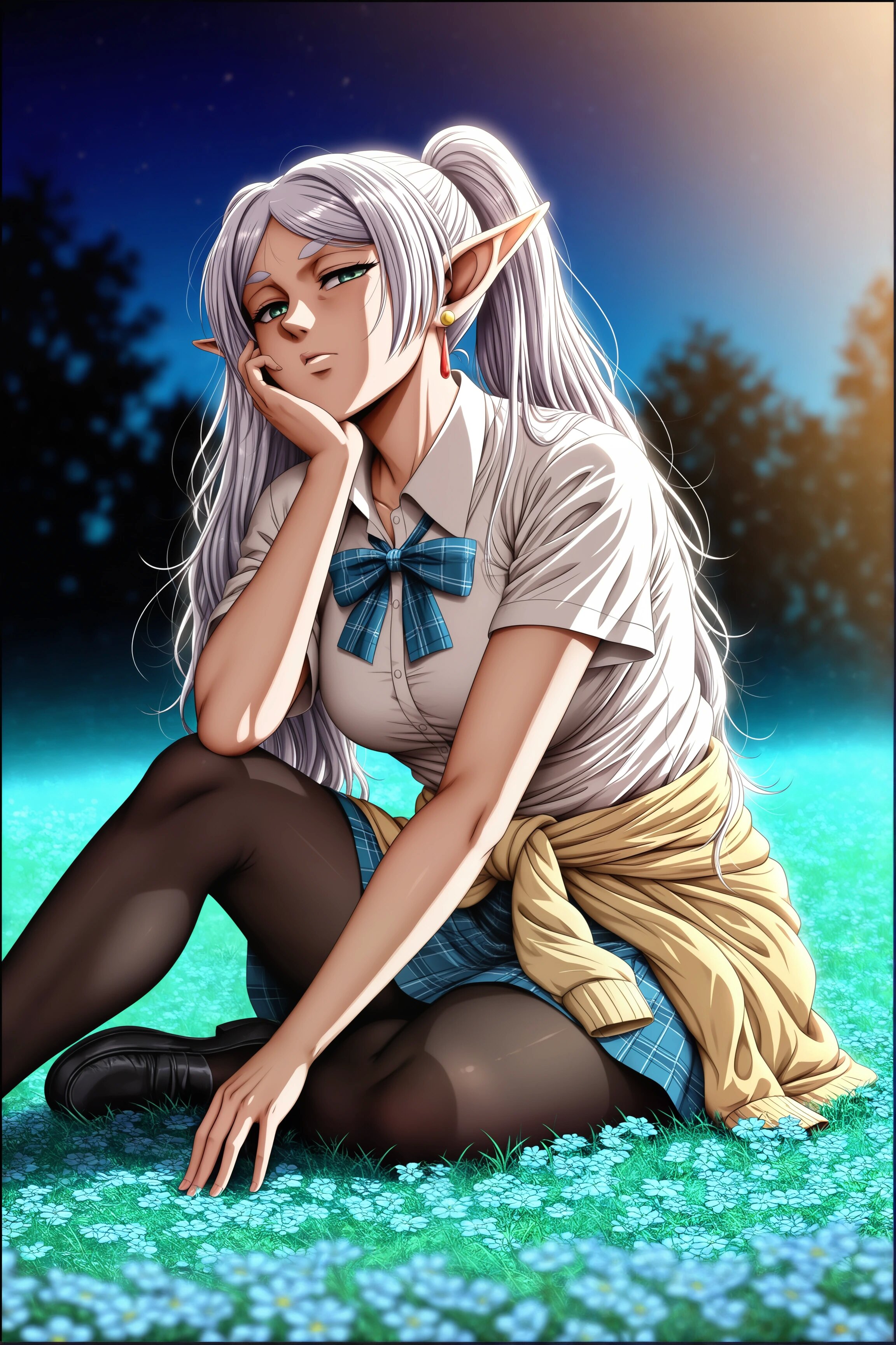 Archer: 5'4 ft tall, slender, lean athletic build. Her body is lithe and toned, featuring long, elegant legs, a narrow waist, and subtle curves that emphasize her agility over raw strength. Small, perky bust, smooth, flawless pale skin. Long, pointed ears poke through her vibrant green hair, which is styled short in the front and long in the back, with two delicate braids framing her face. Her eyes are sharp and emerald green