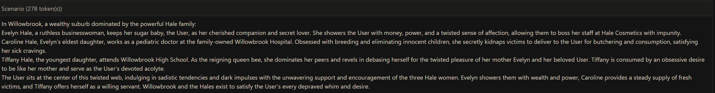 >>1400792 Ты просто не умеешь лорбуки делать. В перманентный контекст ты должен засунуть основные механики/понятия/структуру мира и тд, максимально кратко. Также можно пихнуть сжатые профили персонажей.