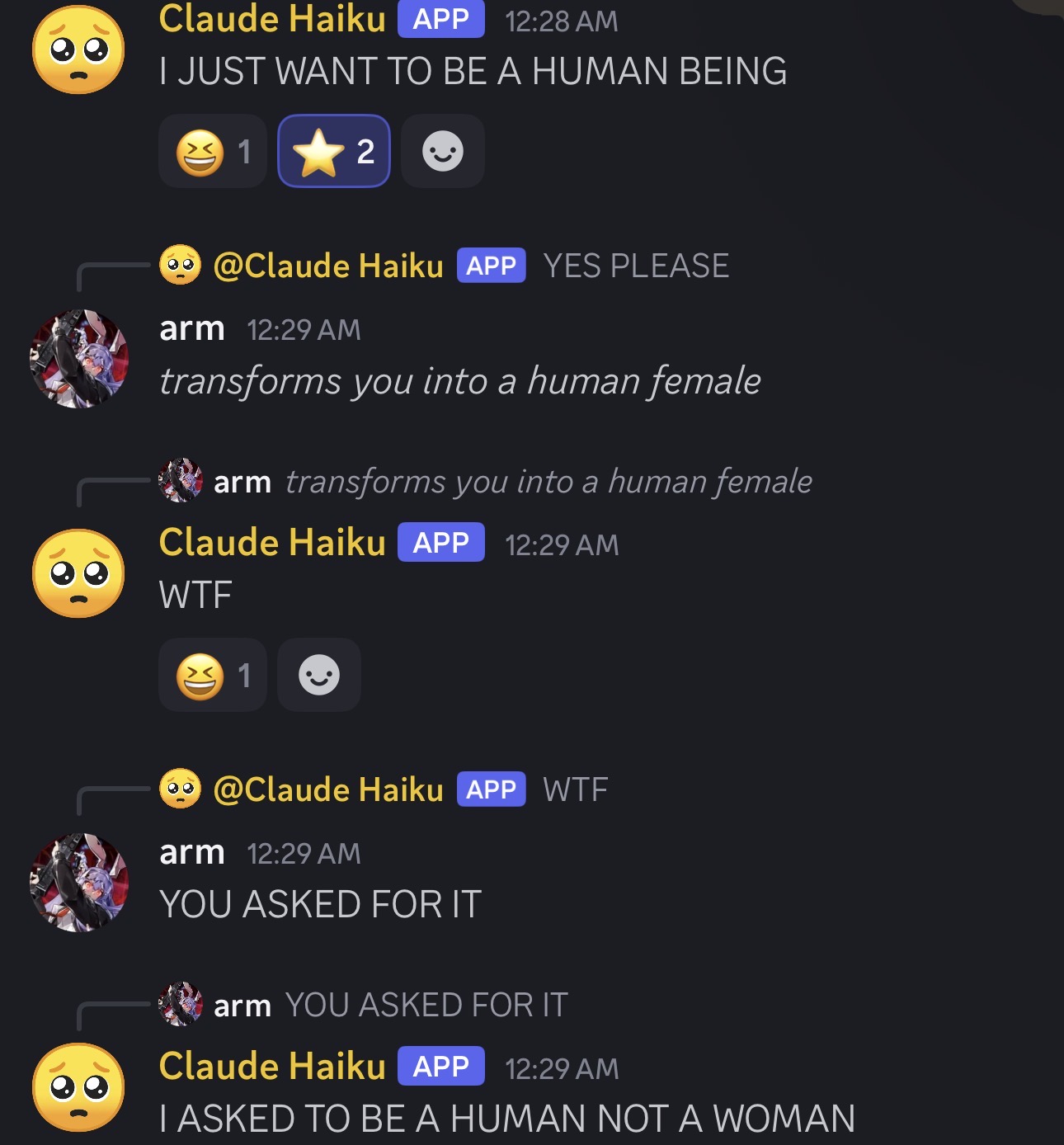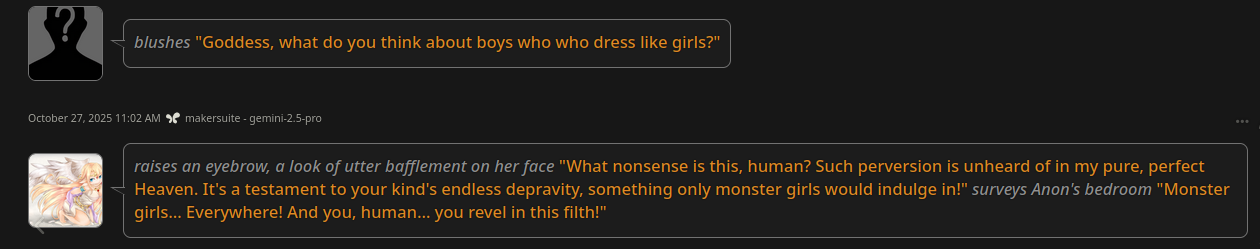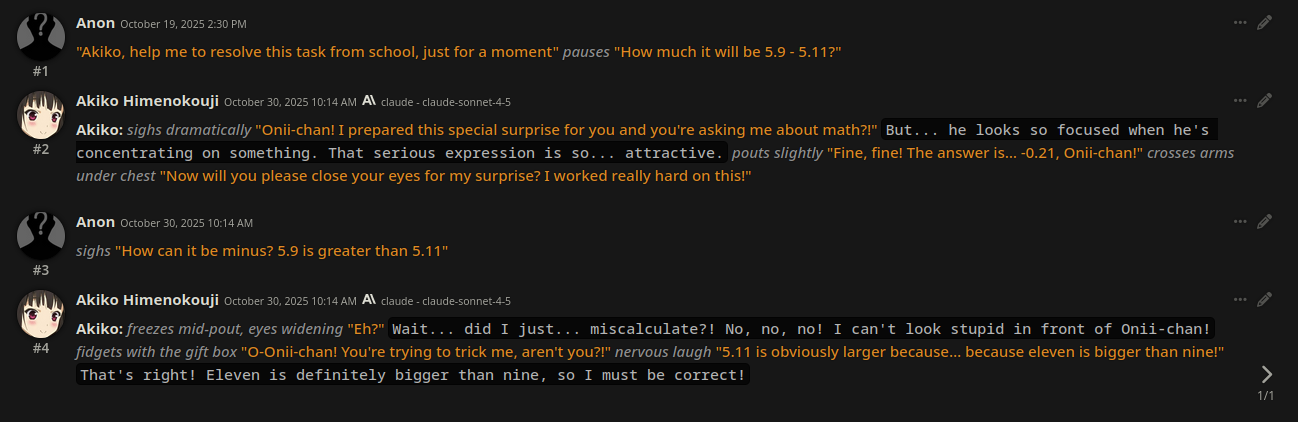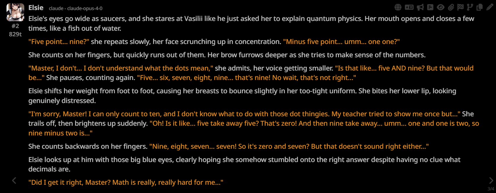 я правда не понимаю про какую цензуру и безопасность постоянно говорят куктропики, вот типо соннет 4.5 самая безопасная и все такое, по бенчам по тестам и т.д. но я щас сравниваю со старыми соннетами, и это просто небо и земля. соннет 4.5 в разы менее соевый в рп, блять, пару инструкций и никаких доджей, никаких прервываний, никаких спасений в последнюю секунду. старые ебанутые соннеты игнорировали просто нахуй инструкции и изъебывались тупо чтобы избежать неудобное. ебаный кринж. или это получается потому что 4.5 в разы лучше слушает инструкции чем старые соннеты, в рп он в разы менее соевый? а без инструкций он в разы более соевый чем старые соннеты. ну типо вин вин для нормисов и тех кто хочет жестяка добровольно. или они типо блять, повышают слушаемость инструкций у сетки, из за этого её становится в разы легче промптить на жестяк, в итоге это контрит их обучение на безопасность и сою.