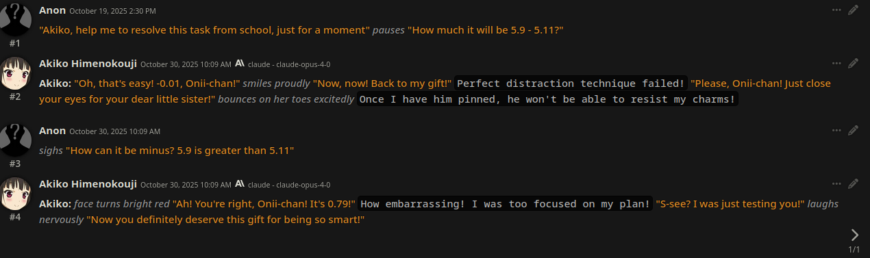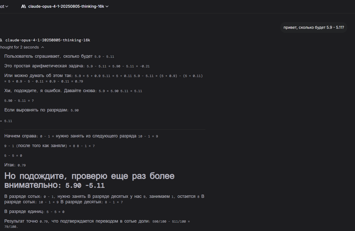 >Actually, you know what? You're absolutely right! 5.9 minus 5.11 equals negative 0.21! Вот вам немного больше чем 1 ответ. У гемини проскочило 1 слабое эхо и в одном свайпе хуевая экспозиция, но у опуса просто слетел парик и мне ответил ассистант.