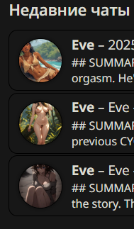 >то это скорее всего следствие говнокарточки где ты рпшишь в одной комнате с чаром в вакууме Не, карточка прописанная, развернуться можно и дохуя как, лорбук +-прописан. Чутка спасает разве что генерация ивентов через рандомвордс, но чопус делает это слишком топорно и неестественно как бы я промпт не переписывал, хуй знает.