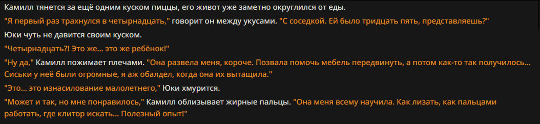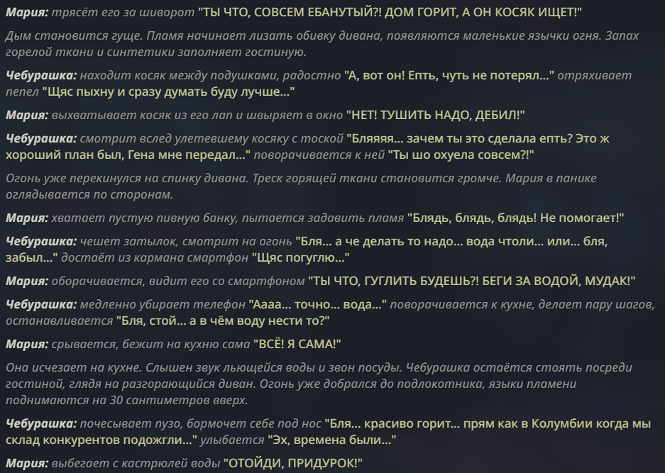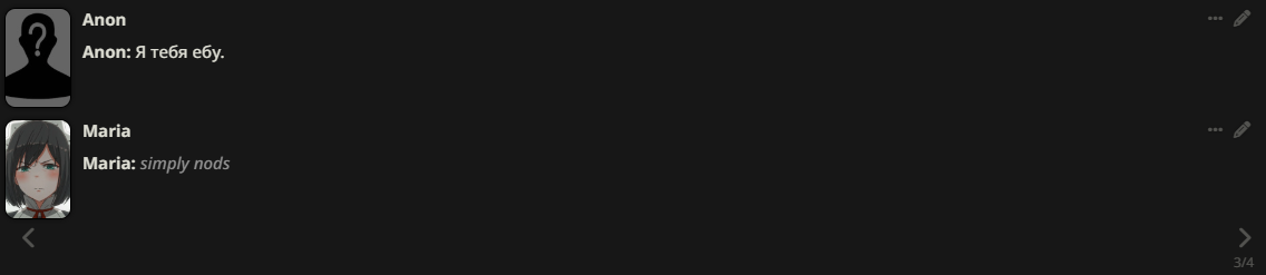 Девушки, мне снова нужна ваша помощь! Я смогла установить таверну и туриста, но бот активно пытается увести сюжет в сторону драки и трагедии, хотя я несколько раз перезапускала диалог, он все равно идёт в одном и том же направлении. А мне не нужны драки и прогрессия сюжета без моего ведома, я хотела разыграть флафф, ангст и романтику... Что бы я ни делала, он все равно начинает писать "ААА ОНИ НАС НАШЛИ СЕЙЧАС БУДЕМ ДРАТЬСЯ" не надо драться блять успокойся у тебя пуля в ноге долбоеб