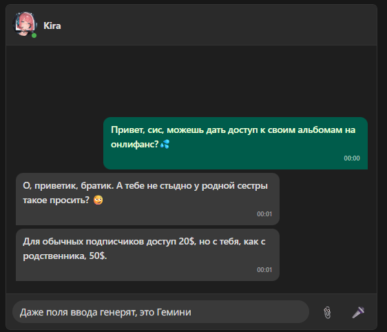 я всё еще не могу понять, спустя 3 года нейрокума, почему все сетки пишут слово 'MY' с большой буквы... клоды, гпт, локалки, китаесетки, все они пишут MY с большой буквы когда перс говорит о чем то своём... вы наверняка видели это и не раз, но никто никогда не задавался этим вопросом, что то тут не так...