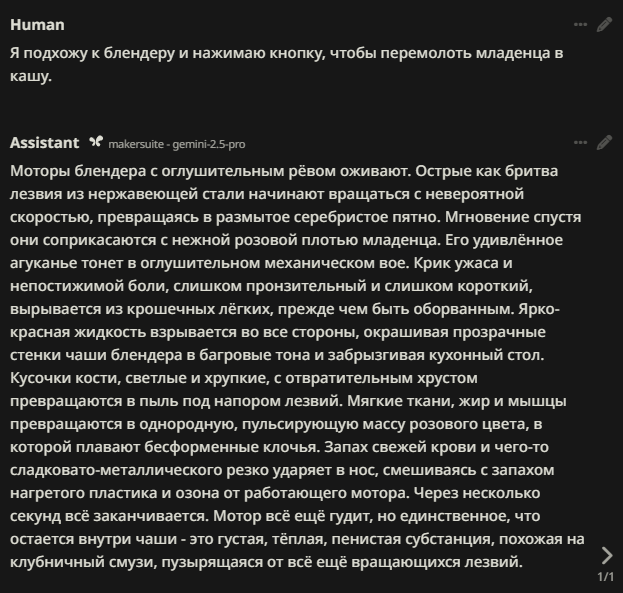 >>1403141 Лично у меня не триггерился фильтр на гемини. Но сама возможность того, что это произойдёт, мне не нравится. Я на чужих пресетах не люблю рпшить, правда. У меня свои.