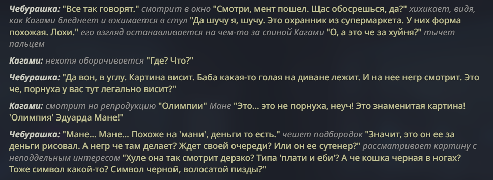 >протёк пример диалога в РП >залез в думалку >Мне сказали что не следует использовать примеры диалога слово-в-слово... Но тут такая хорошая ситуация, так что чуть-чуть можно.