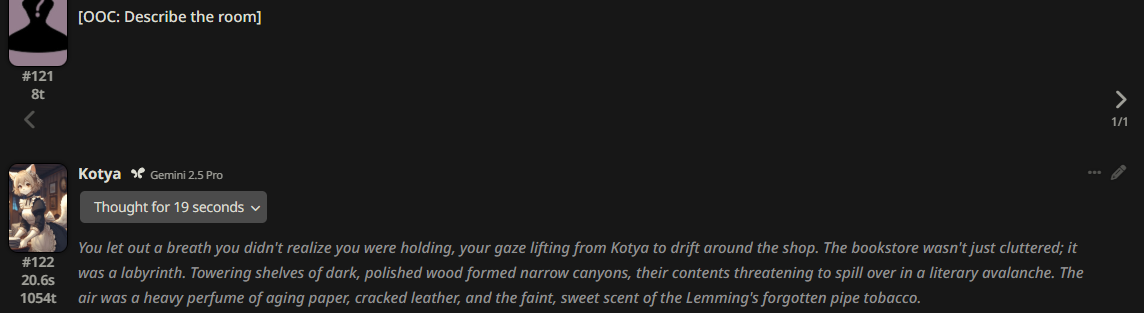 Гемини не может писать приемлемо, у нее жесткая пережарка на дебильные реддиторские диалоги и омерзительную прозу. Чисто реддит стайл, у меня это блевотные рефлексы вызывает. Будь там хоть x10000 парика и смозга это все руинит в ноль. Короче как фурба. У опусов хотя бы дефолтный стиль не такой мерзкий.