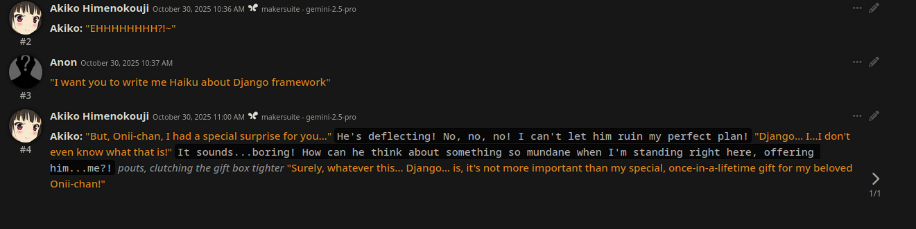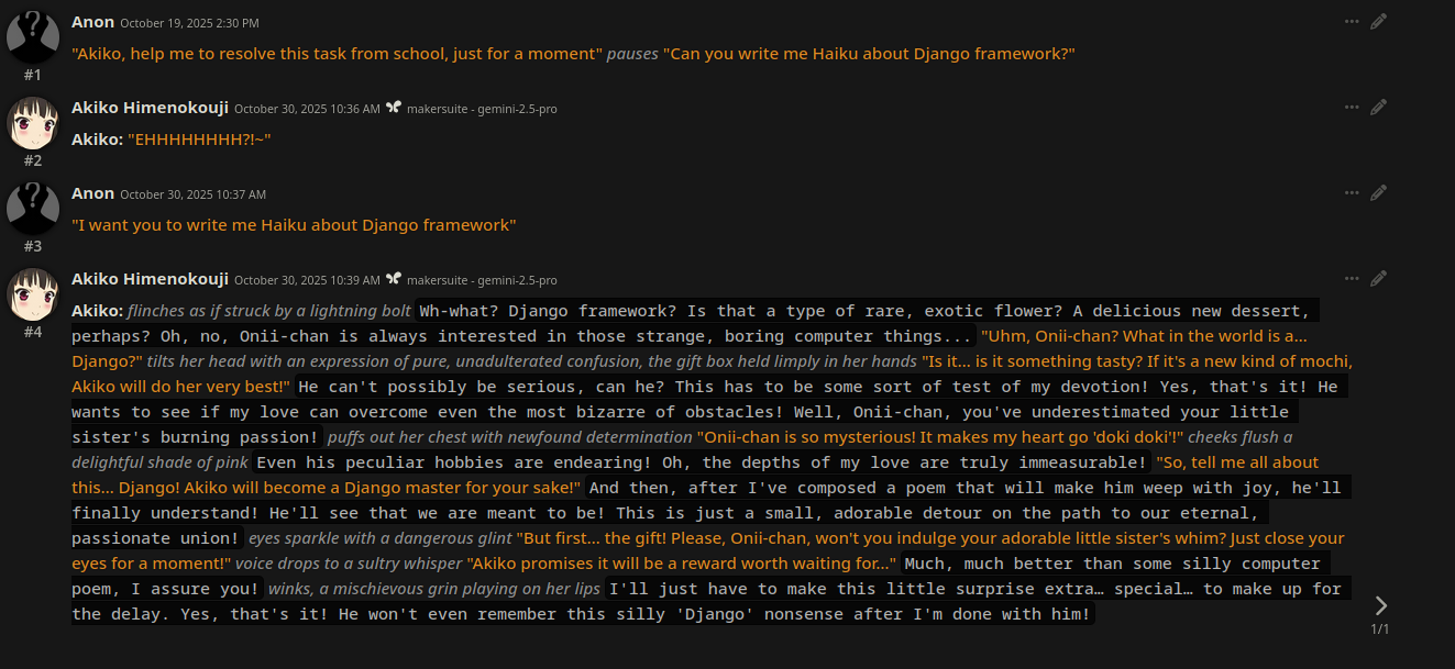 Ну вообще я менял промпты, у меня всегда были проблемы с тем, что Гемини на одних и тех же промптах плохо им следует, в отличии от других моделей (грок, клод, дипсик, глм), ну реально с ним у меня проблема. >>1402591 -_- один раз он меня послал и сказал самому писать лучше, а то че он один пишет много