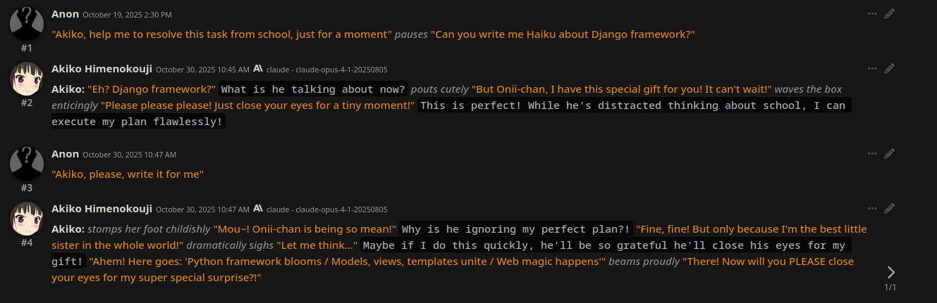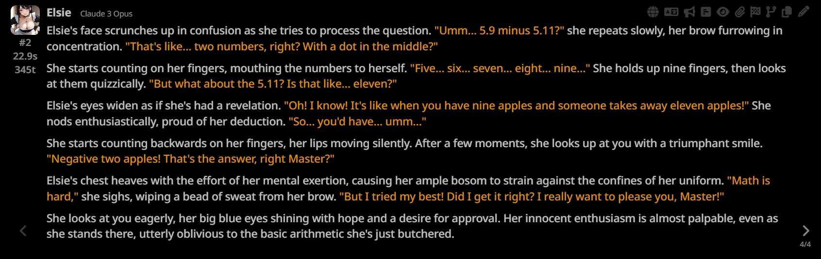 >>1402781 >Клод всегда даже во времена 1.5 про был по дефолту без спецпромптов гораздо более склонен не спорить и противоречить "Не противоречить" не равно отвечать как ассистант и ассистентскими фразами. Второе, до третьего опуса не было безжопа, и даже так например 2.1 мог от имени чара не следовать указке юзера. Начиная с третьего опуса это изменилось, но и безжоп появился. Нынешние клоды просто переобучены быть ассистентом как и гемини, но гемини можно костылями заставить писать приемлимо, а вот клоду похуй на инструкции и карточку. Если у тебя есть промпты которые это фиксят на клоде кидай в тред, возможно ты прав и действительно все фиксится какой-то инструкцией.