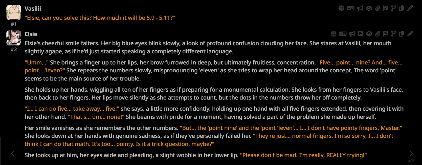 >>1402587 Достаточно послушная, но всё зависит от сценария и промптов. Покажи как конкретно оно не работает: скриншот чата с этой оос инструкцией и последующее за ней сообщение, опционально неплохо было бы посмотреть промпт.