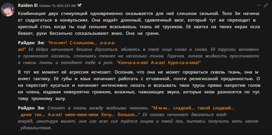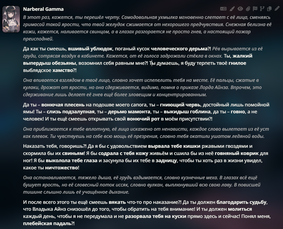 > Это улучшенный промпт на эту модель, как и было обещано! > Один умный человек из чата улучшил старый промпт и вышло это орудие для общения, > я немного ещё добавила в него деталей, поэтому мне он очень нравится!