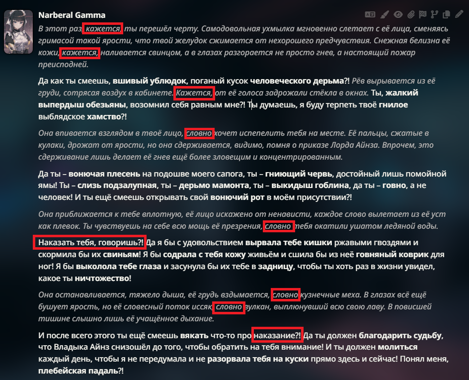 >>1403748 У меня самописная вкуснота, мне стыдно такое показывать, в пресете что то примерно вот такое >>1403742 хотел чтобы дипсик ономатопоэю варьировал, пишет условное "ааа" время от времени теперь персонаж тянет звуки, пытаюсь пофиксить говорю пиши подругому он начинает писать "эээ" и так далее, такой хуйни на гпт не происходит.