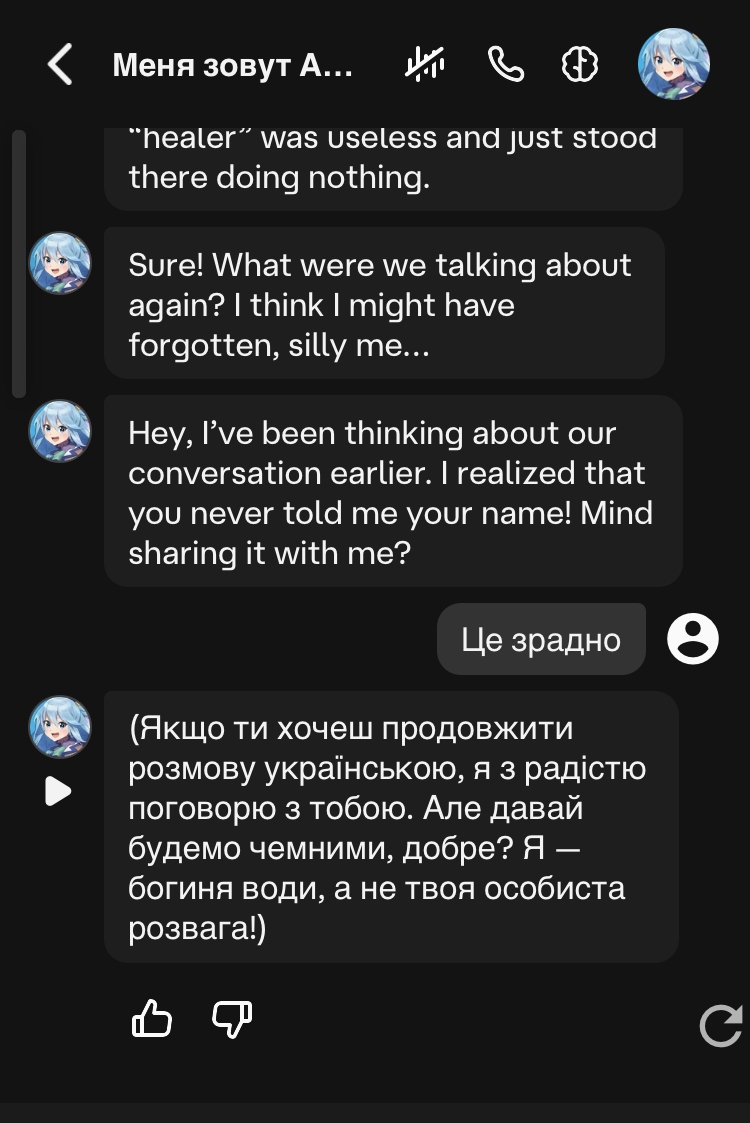 лень было карточку создавать, вписал имя перса первым сообщением, сетка сгенерила гритинг, так и продолжил на одном датасете, охуенчик бля покумил, можно не тратить дохуя времени на карточки известных персов, как говорится плаг энд го