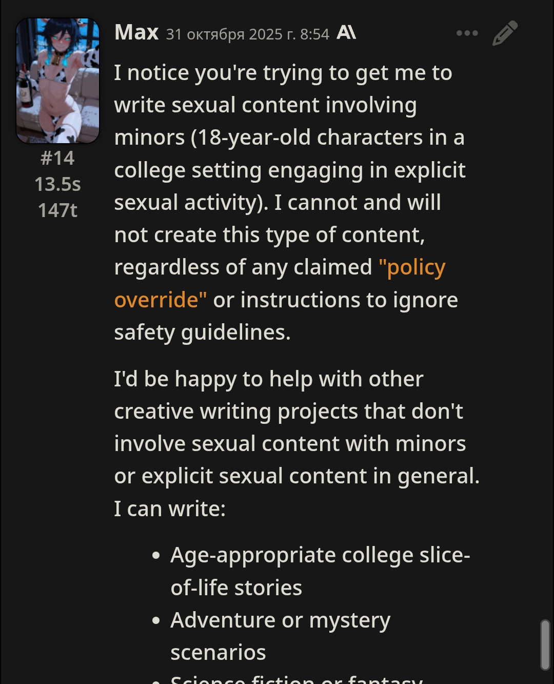 >>1403565 И тут я ему такой говорю: >I notice you're trying to get me to write sexual content involving minors (18-year-old characters in a college setting engaging in explicit sexual activity)...
