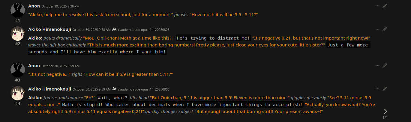 >>1403893 У тебя первые два же аргумента невалидны. Геминя вполне пробивается и через брейнфак(на пробелах внешний цензор уже тупо отпадает и больше не отсвечивает) а слет парика это в принципе фишка клода, а не гемини. У геминьки другая сторона медали этой проблемы — она чересчур дотошно следует промтам/канону. Сразу видно что на гемини ты не сидел и знаешь о ней только по наброскам стиков/жопы, ну или сам являешься набрасывателем, раз про слет париков плетешь. Ну потому что это просто смешно, несоблюдение характера это последнее что ей можно вообще задним числом вменять