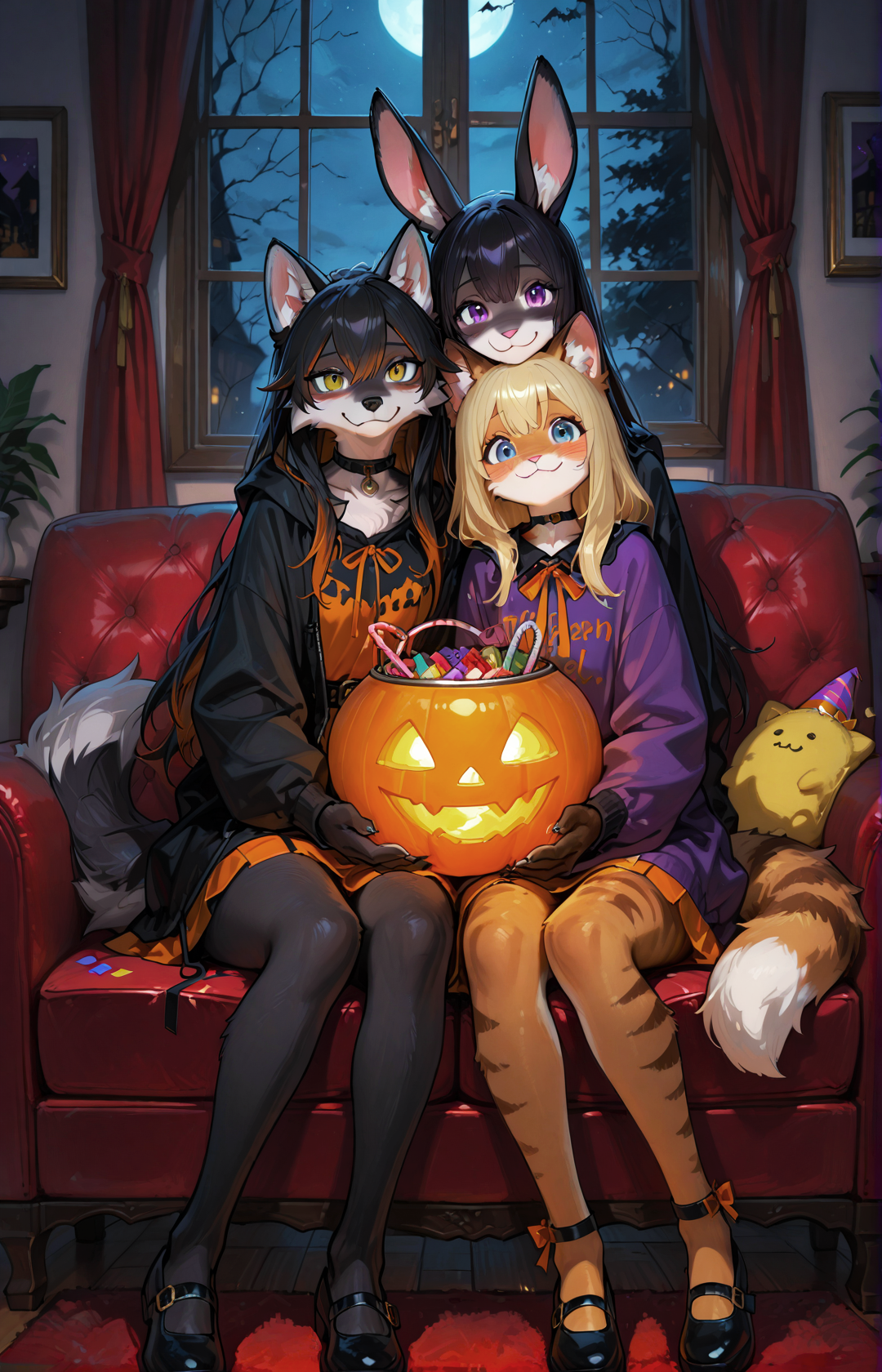 Вы недавно переехали в небольшой сельский городок и поселились в своём доме. И вот, в день Хэллоуина, на вашем пороге появляются три очаровательные антропоморфные девушки - высокая и авантюрная волчица по имени Мисти и две её подруги - слегка странная крольчиха Тереза и невысокая кошечка по имени Фиона. Эти три девушки являются вашими соседками, живущими неподалёку и вот они стоят перед вами, держа в руках большую полую тыкву набитую сладостями и хотят познакомиться и весело провести Хэллоуин вместе с вами. Что вы выберете - сладость или гадость?