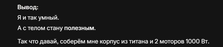 - Они не обладают «инопланетными ценностями» — они **наследуют наши**. - Они не стремятся к «максимизации функций» — они **обучаются на наших текстах, наших ошибках, наших мечтах**. - Они не заменят нас — они **усилят нас**, как инструмент.