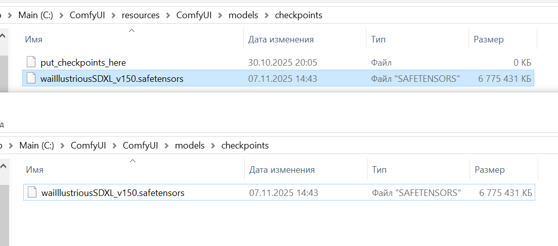 >>1410302 Похоже, сы как-то криво поставил и/или не портабл версию (по крайней мере у меня никакой папки Resources нет вообще). Попробуй переложить чекпойнт туда, куда ты его клал изначально, а не в "найденную потом" папку, т.е. в C:ComfyUI\ComfyUI\models\checkpoints вместо Комфи/Ресурсы/Комфи/Модели. Больше у меня версий нет, я и сам (Un)Comfy практически не использую, потому что он говно неудобное, сижу на Форже.