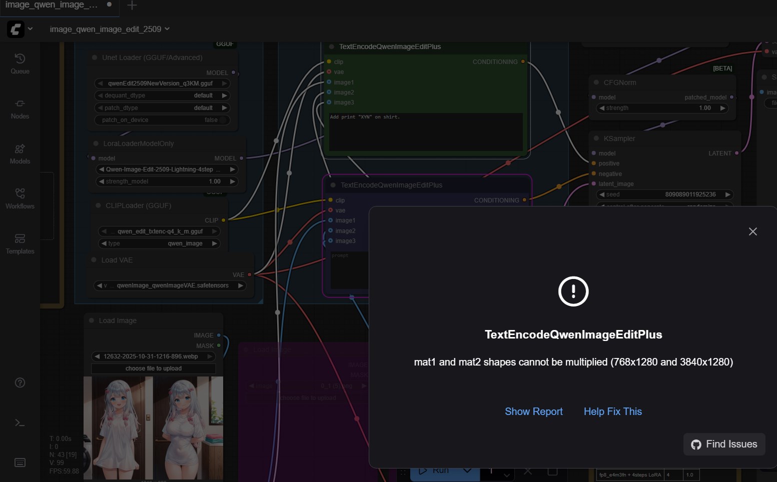 >>1411544 >>1411548 >>1411560 Не, всё попробовал, дрова обновил, комп перегрузил, воркфлоу заново собрал ничего не копируя из старого, так же проблема, вылетает тут с ошибкой. Я только накатил комфи, мб что-то не натсроил. Или пикчу для редактирования надо меньше делать?