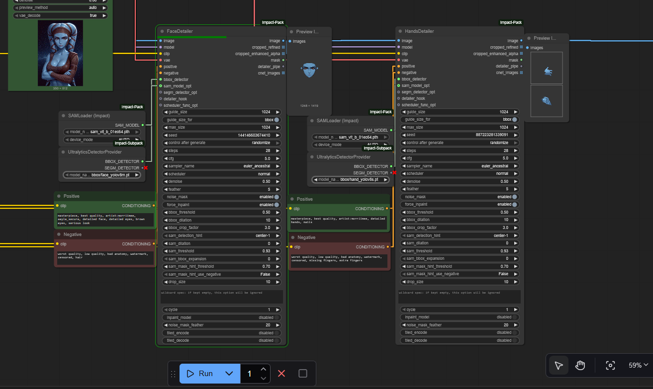 >>1412599 У меня сделано вот так в одном из воркфлоу, сразу происходит апскейл 1.5х и дорисовка рук и лица используя Face Detailer. Нужны дополнения impact pack, impact subpack и efficiency nodes. Там 2 фейс детайлера, один лицо рисует второй руки, для каждого свои поля промптов. Выглядит как пиздец но зато одной кнопкой делает приемлемо. жисон перетащи в комфи и через манагер докачай расширения https://files.catbox.moe/uyl5tn.json