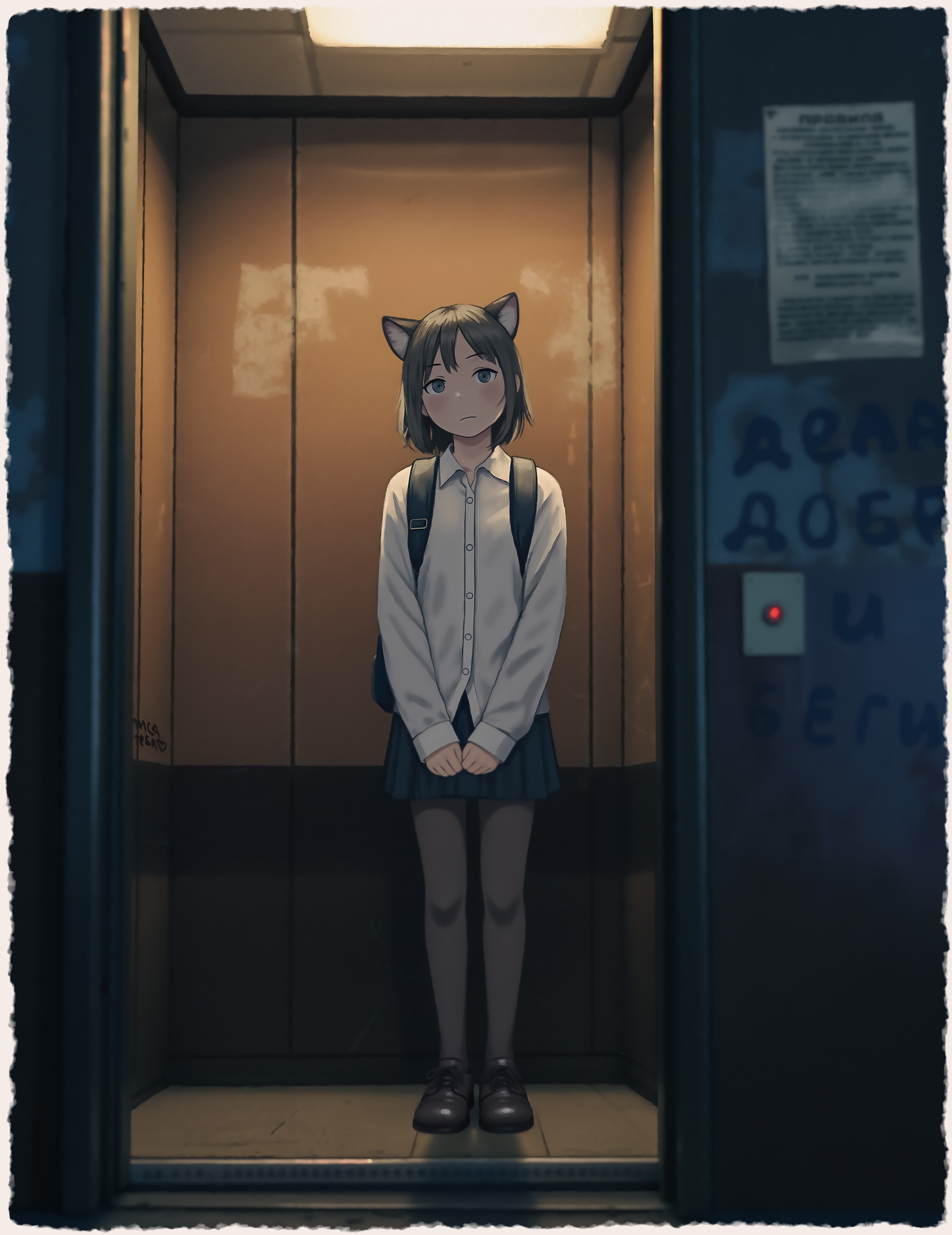 >>1415520 Если кропнуть убрав нижние 15% то все даже хорошо, совлово, тревожно, мило. Все заключается в нижнем крае лифтовой кабины, который нельзя просто так увидеть - ощущение что лифт движется, и стыке обуви с полом и освещении там - тень неестественная, кажется будто Кшк не стоит а левитирует. >>1415529 > нормисы Лол