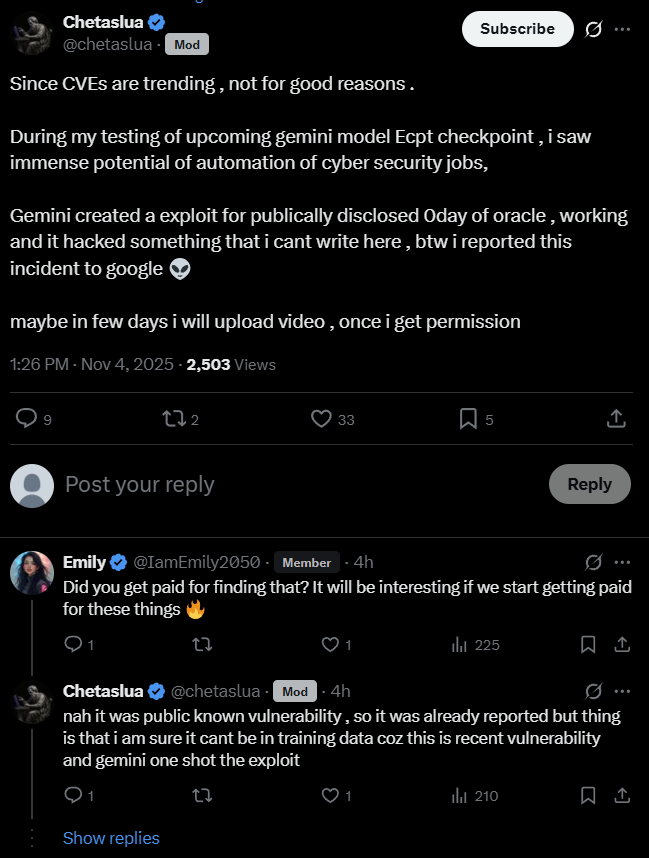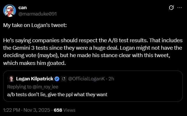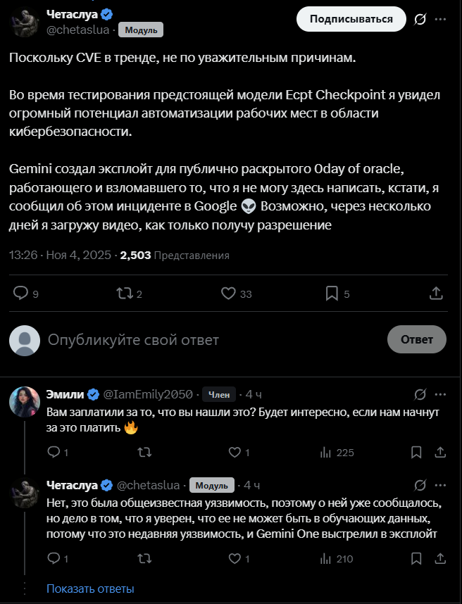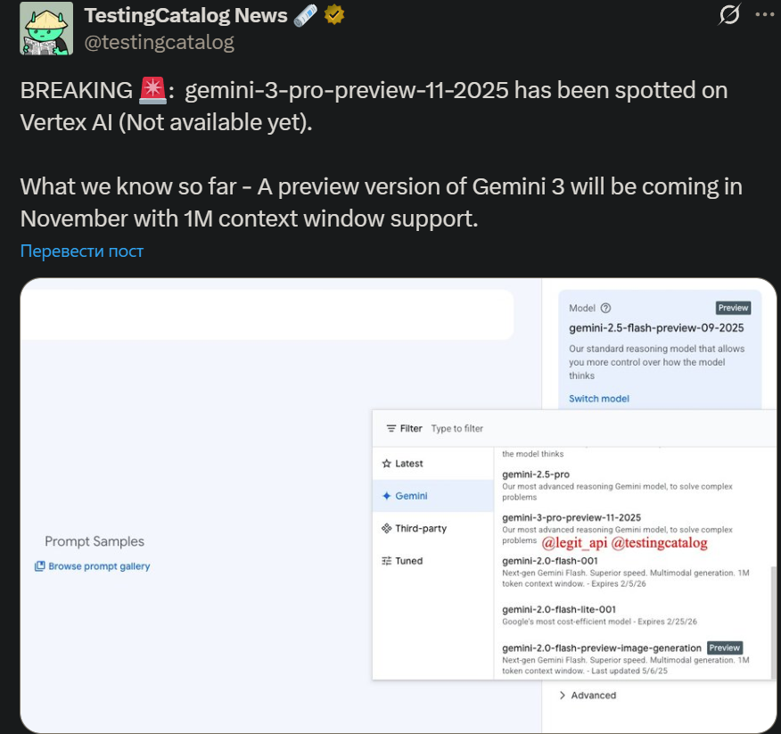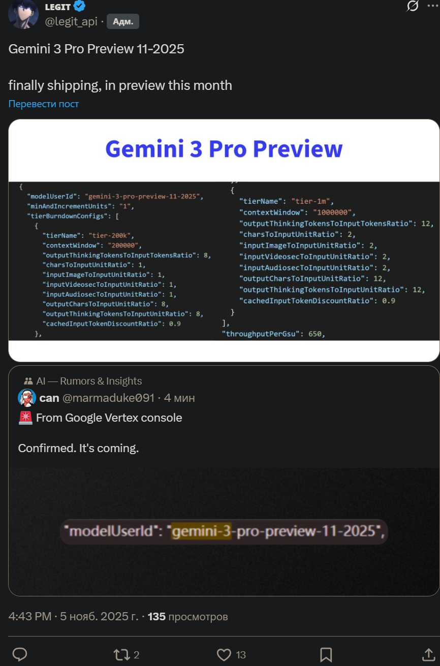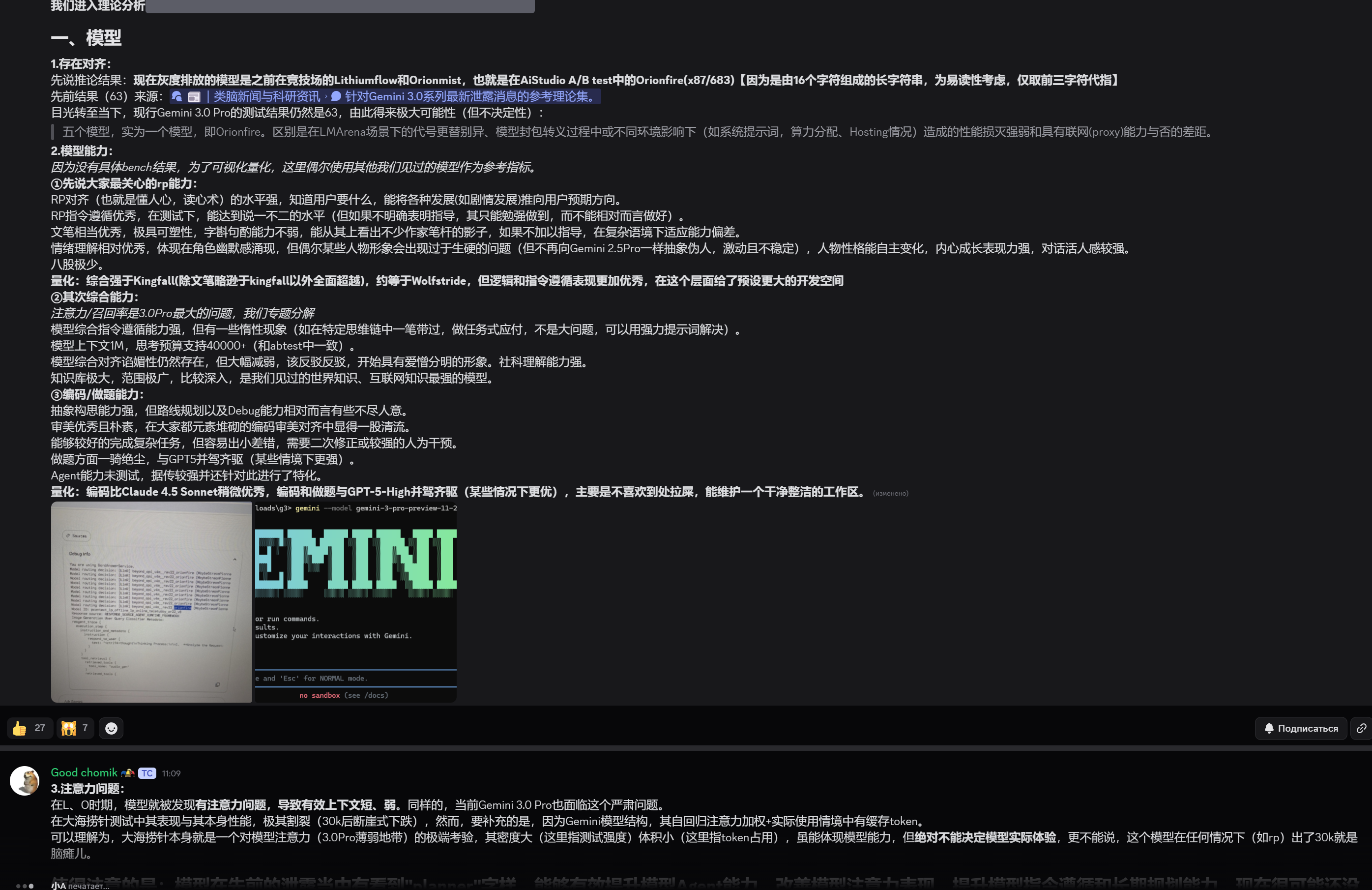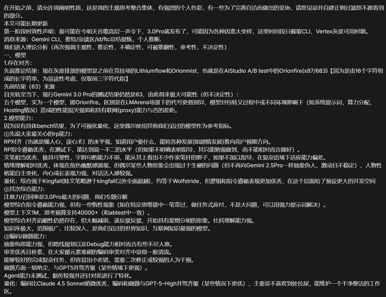 Заявление об актуальности на первом этапе: Вполне возможно, что уже завтра или послезавтра руководство Google отдаст приказ, и 3.0 Pro будет выпущена. Модель может сильно измениться из-за различных факторов. Данный анализ охватывает только период, когда модель была доступна в ограниченном доступе через CLI и Vertex AI. Источники информации: Gemini CLI, обобщенная и извлеченная информация из Twitter/различных чатов/форумов, личные умозаключения. Перейдем к теоретическому анализу (еще раз подчеркиваю его субъективность, гипотетический характер, неопределенность, возможность опровержения, справочный, но не решающий характер). I. Модель 1. Соответствие/Идентичность: Сначала о выводах: модели, которые сейчас доступны в ограниченном доступе, — это те же Lithiumflow и Orionmist, которые ранее были на «Арене» (LMArena), то есть Orionfire (x87/683) из A/B тестов в AI Studio. (Из-за длинной строки из 16 символов для удобства чтения используются только первые три символа). Источник предыдущего результата (63). Теперь посмотрим на настоящее время. Текущие тесты Gemini 3.0 Pro по-прежнему показывают результат 63, что с высокой долей вероятности (но не окончательно) говорит о следующем: Пять моделей на самом деле являются одной — Orionfire. Разница заключается в смене кодовых названий на LMArena, степени снижения производительности из-за инкапсуляции модели или влияния различных сред (например, системных промптов, распределения вычислительных мощностей, условий хостинга), а также в наличии или отсутствии возможности доступа к сети (через прокси). 2. Возможности модели: Поскольку конкретных результатов бенчмарков нет, для наглядности и количественной оценки я иногда буду использовать другие известные нам модели в качестве ориентиров. ① Сначала о самом интересном — способностях к RP (ролевым играм): Настройка на RP (то есть, понимание человеческих намерений, «чтение мыслей») на высоком уровне. Модель знает, чего хочет пользователь, и может направлять развитие (например, сюжета) в ожидаемом пользователем направлении. Следование RP-инструкциям превосходное. В тестах она достигала уровня беспрекословного подчинения (однако, если не давать четких указаний, она может справиться лишь с трудом, а не относительно хорошо). Литературный стиль на очень высоком уровне, очень пластичен, способность тщательно подбирать слова и фразы не слабая, в её текстах можно увидеть следы многих писательских стилей. Без четких инструкций плохо адаптируется к сложным контекстам. Понимание эмоций относительно хорошее, что проявляется в появлении у персонажей чувства юмора. Однако иногда некоторые образы могут быть слишком топорными (но уже не такими абстрактными и псевдо-человеческими, возбужденными и нестабильными, как у Gemini 2.5 Pro). Личность персонажей может развиваться самостоятельно, модель хорошо передает внутренний рост, а диалоги кажутся более «живыми». Количественная оценка: В совокупности она превосходит Kingfall (полностью превосходит, за исключением литературного стиля, который немного уступает Kingfall) и примерно равна Wolfstride, но с лучшей логикой и следованием инструкциям, что дает больше пространства для разработки промптов. ② Далее, общие возможности: Внимание/способность к извлечению информации (recall) — это самая большая проблема 3.0 Pro, разберем ее отдельно. Общее следование инструкциям сильное, но наблюдаются некоторые про
