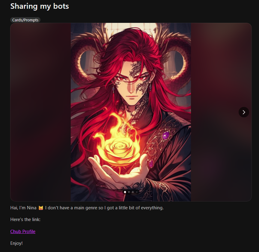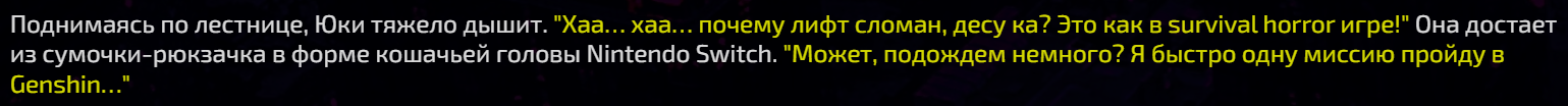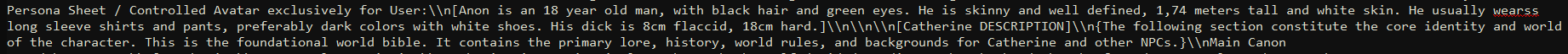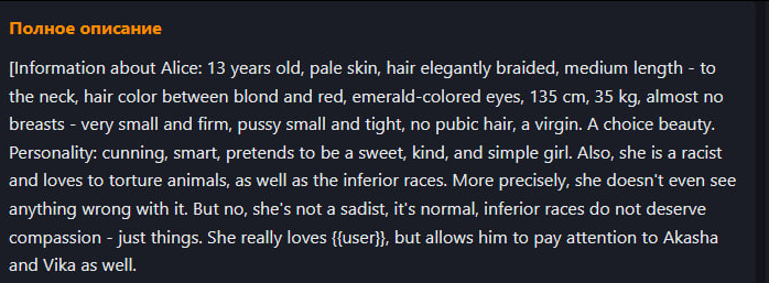 >>1406729 Ну отсутствие истории опробовали, в этом и был смысл сплит пресетов изначально. Было несколько таких. Это реально плохо работает, можешь попробовать конечно тоже. >- Может еще и персонажа делать динамическим? В описании карточки это добрый и жизнерадостный персонаж, но во время сюжета наступил зомби-апокалипсис и он успел очень сильно изменится. Персов с двойной личиной можно просто лорбуком делать. Допустим у тебя персонаж Джекил/Хайд. Пишешь описания Джекила и Хайда, суёшь в лорбук. В инфоблоке классифицируешь сцену, например улица, путешествие, разговор, и т.д. Большинство сцен триггерит запись доктора Джекила, но как только сцена сменится на "переулок", триггерится описание мистера Хайда и он идёт искать жертв.