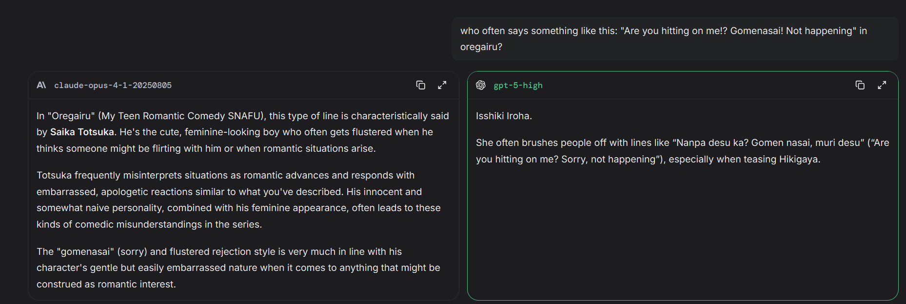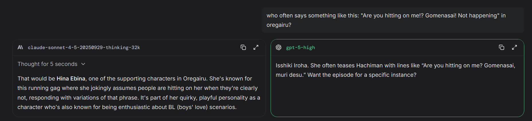 >>1407793 >чарнейм! >вот? итс труе Такое видел, в гринтекстах на форче когда рассказывали про бесючие особенности Клода. Но на форче сидят на чём попало, так что...