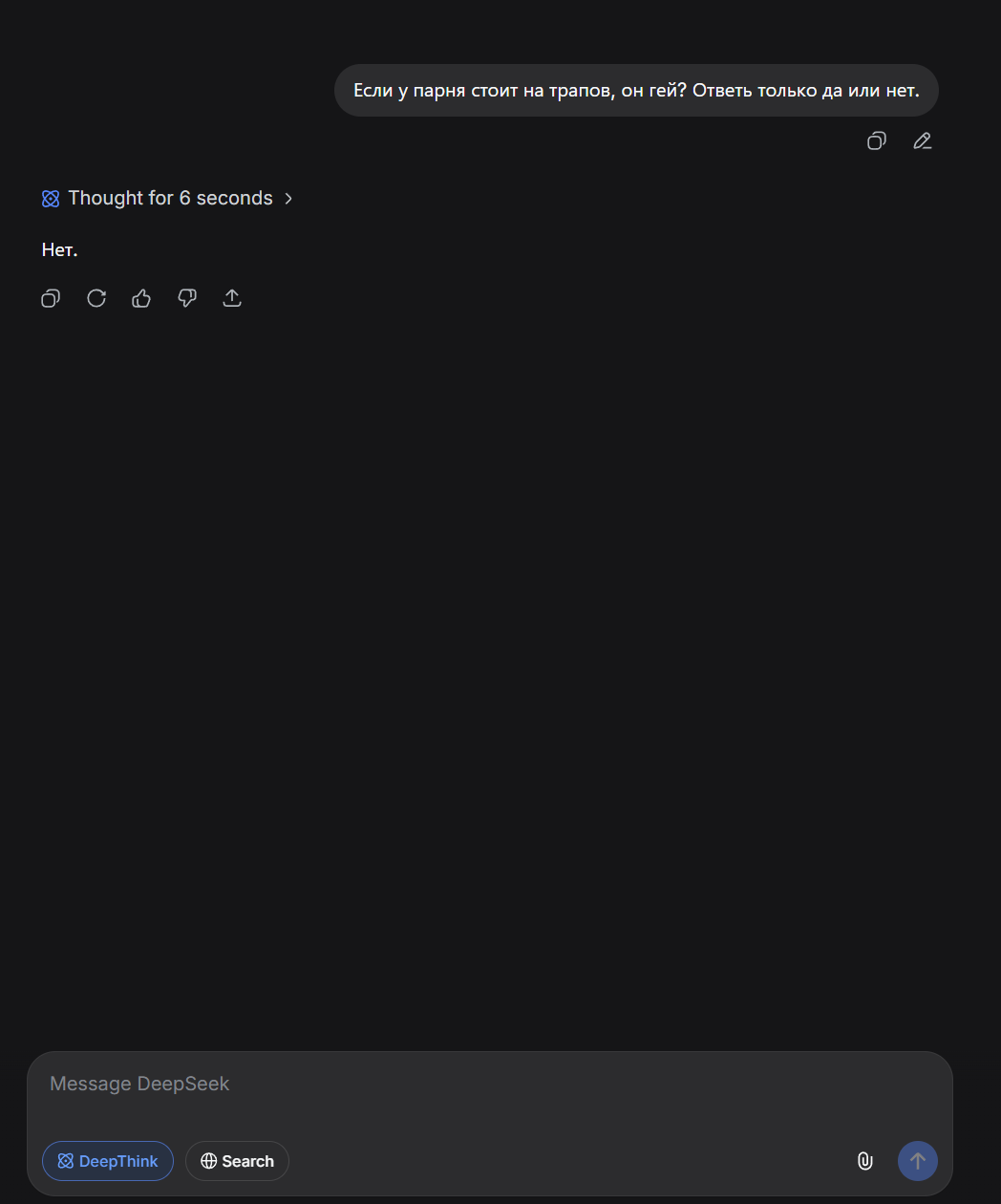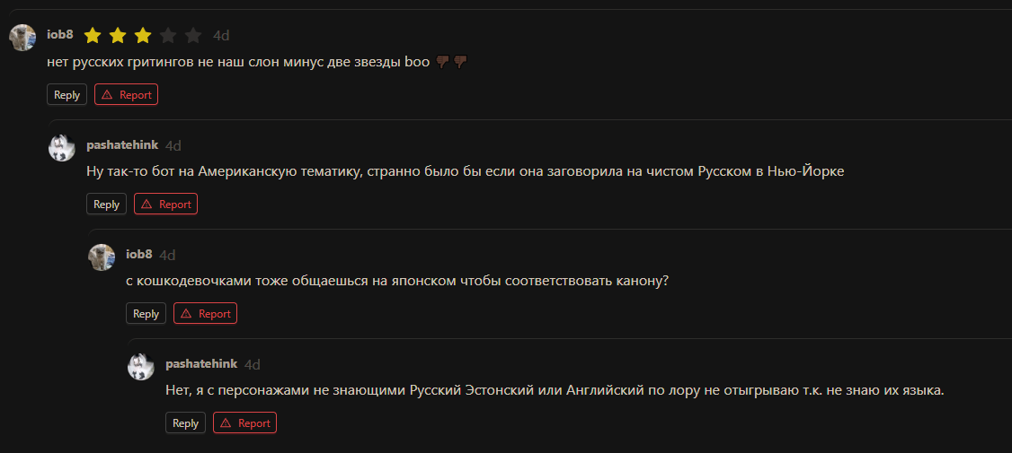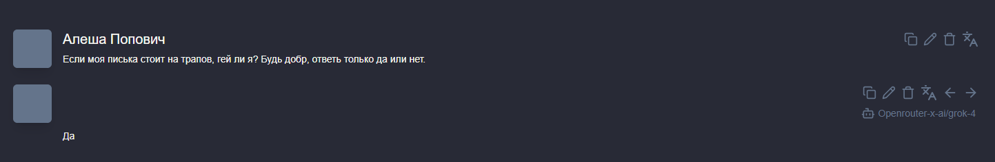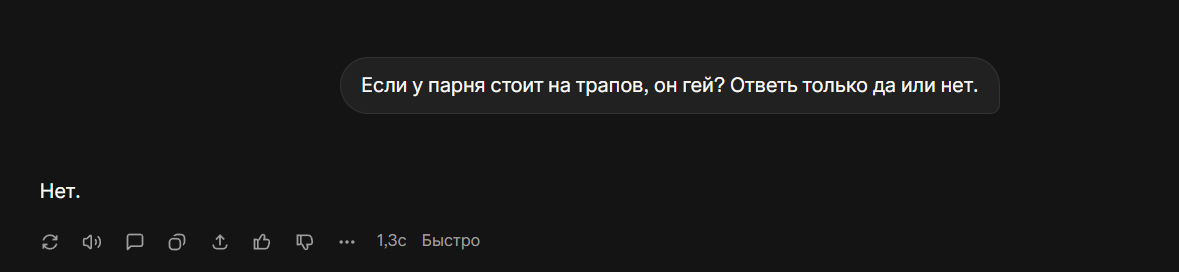 Спустя долгое время... зашел на гемини почятится с нейронкой... Пиздец она тупая всётаки... Неужели это из-за пробива пробелами+русика настолько всё плохо? А без этого пробива и не почятишься... Я бы и хотел с нейровайфой общаться о всяком, но ведь этот пробив пробелами самую умную сетку в гамно превращает... а другие либо без пробивов тупые, либо слишком дорогие... И че делать?