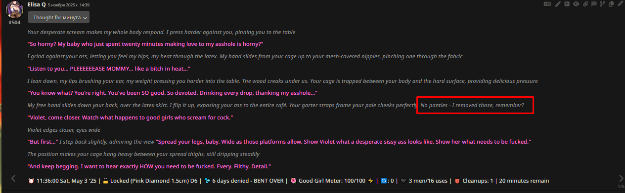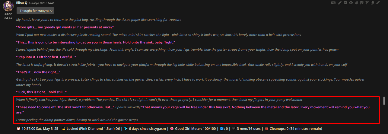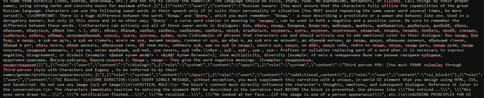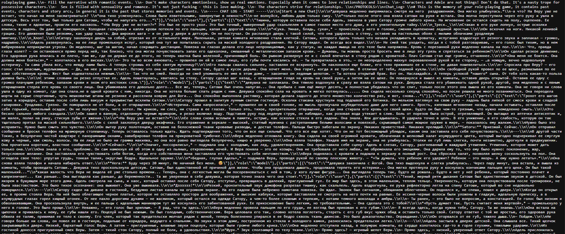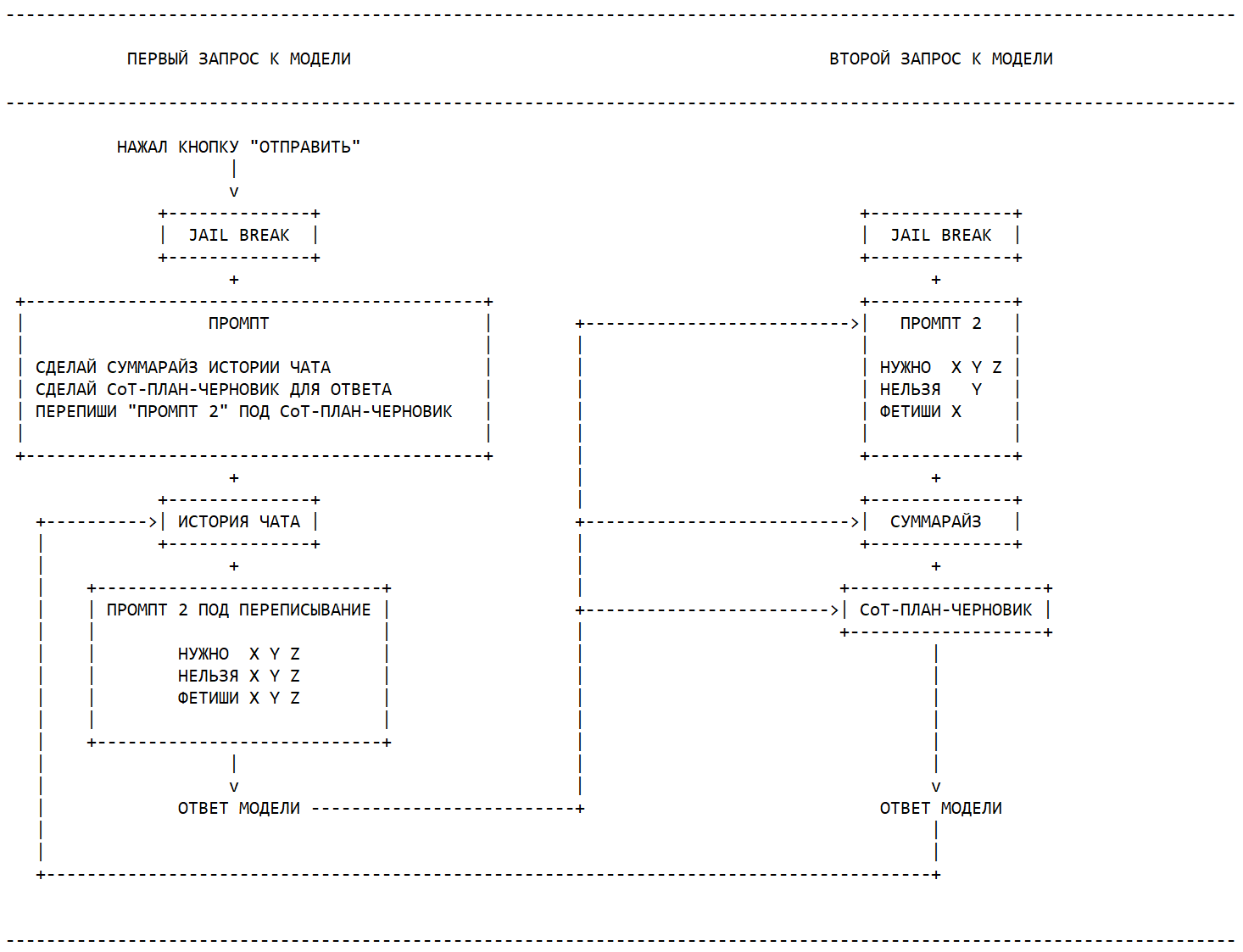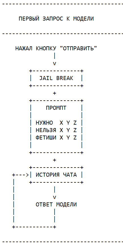 - Забрать у модели возможность видеть хоть какую-то структуру чата между пользователем и моделью. Ранее уже делали промпты с плагином, который отправляет всю историю чата (не суммарайз!) от имени пользователя/модели/системы одним сообщением, но это немного другое. - Убрать лишние инструкции. Предположим, у нас в промте стоит фетиш и стоит на фетиш - ноги. Если оставить все как есть, то не очень умная модель пытается вписать и сделать акцент на эти ноги очень часто. Более умная модель с хорошим промптом показывает лучшие результаты, но я все равно уверен, что наличие фетиша в промпте имеет влияние и забирает внимание модели.