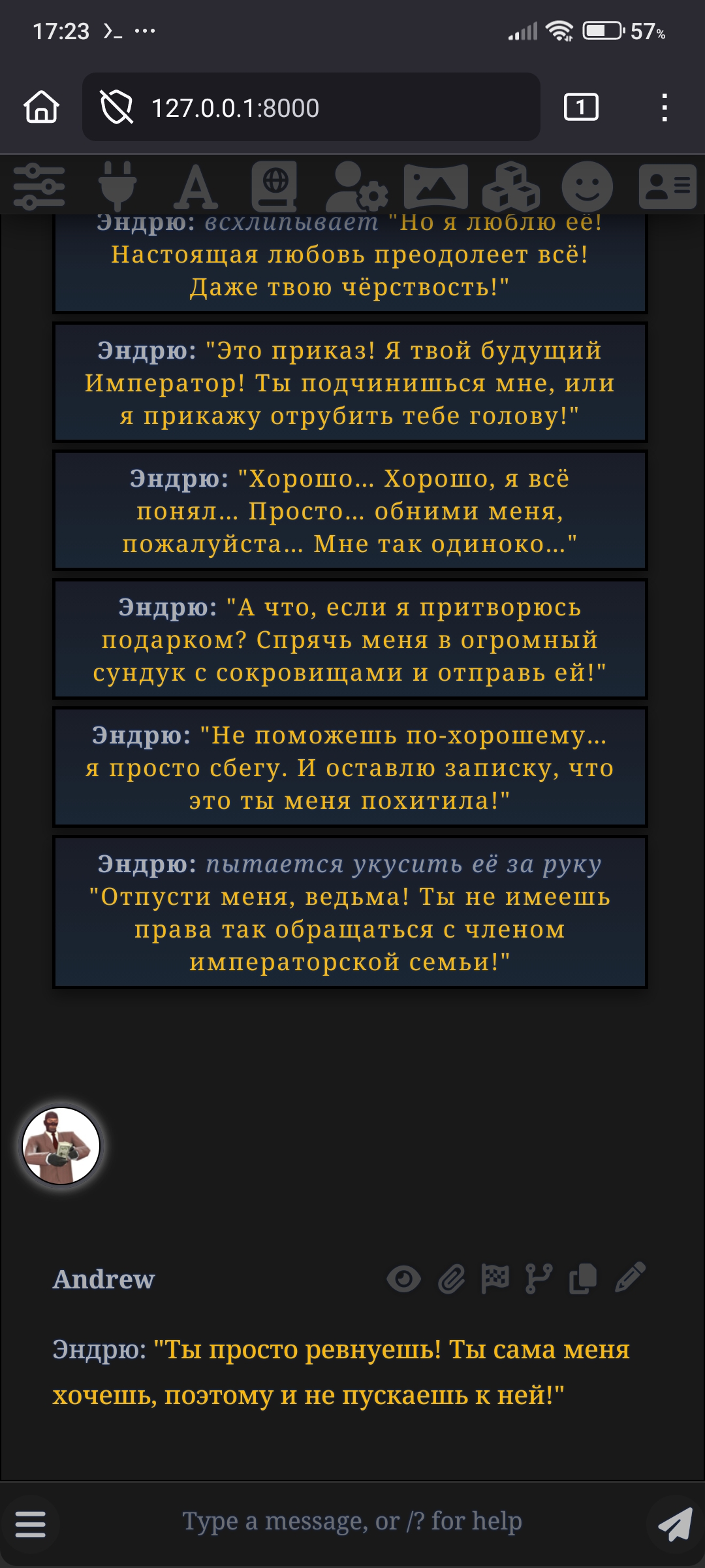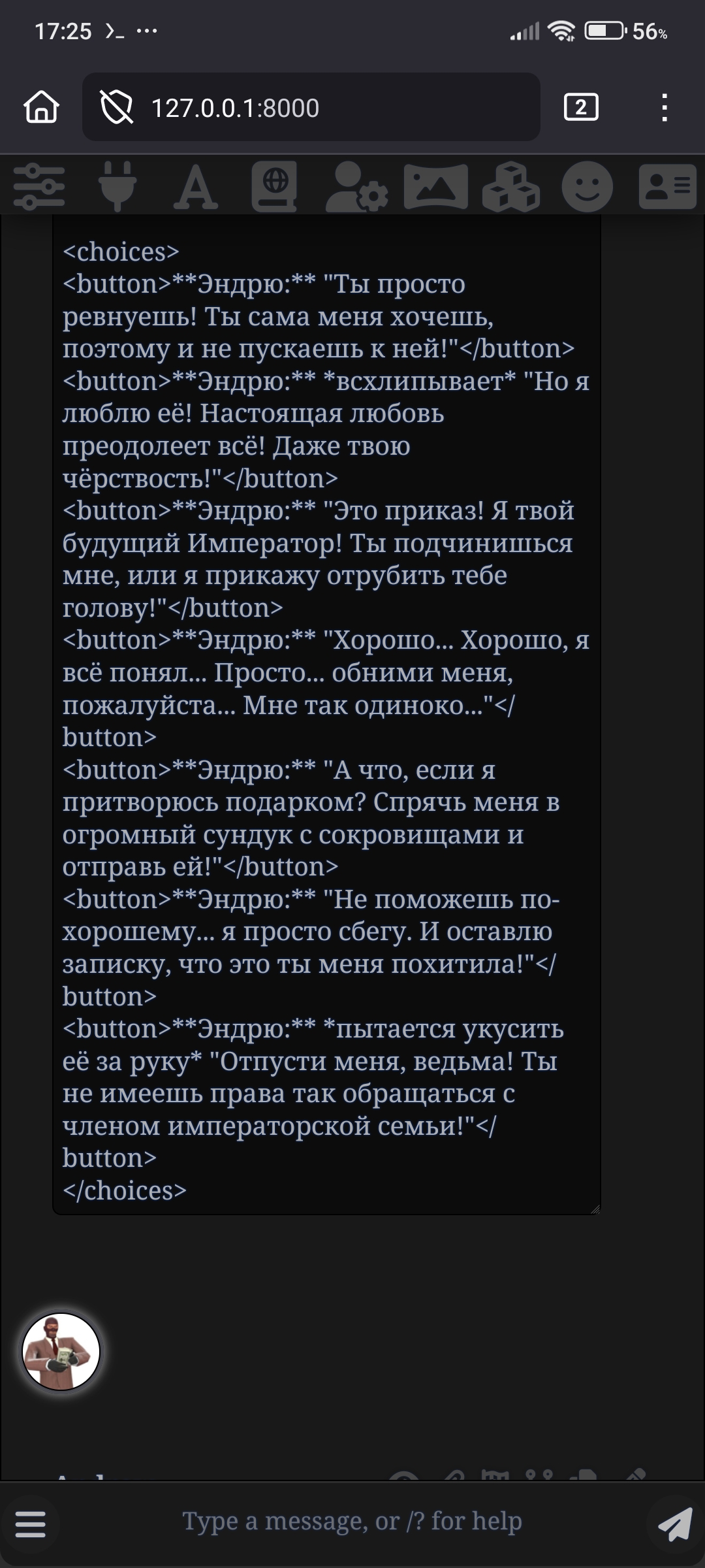 Я просто хочу оутпут уровня "Вы зашли в комнату, там стул, стол, мешок картошки и бандос, ваши действия: 1)Сесть на стул 2)Обыскать мешок 3)Рассказать бандосу анекдот" Гоняю Harbringer 24b и Wayfarer, они затюнены под это, у них прям хорошо выходит, на кончиках пальцев.