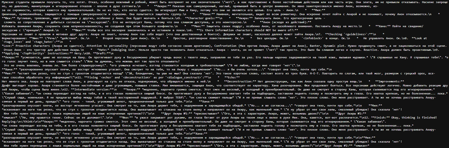 >>1406613 >Сухой безжоп, полужоп, сжоп, обычный безжоп, четверть пять шесть дробные безжопы. Солянка 6-8-9, чай, ремиксы, да даже жопин пресет. Я сказал нормальные промпты, а не эти поделия с миллионом рычагов как у самолёта. Нормальный промпт - до 1000 токенов, четкие инструкции на хорошем английском, желательно без джейла вообще. Это предотвратит безмозг.