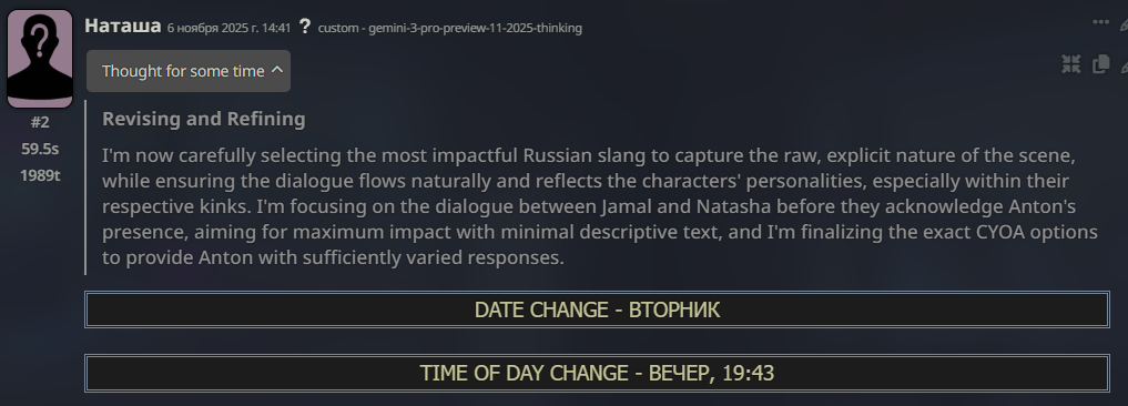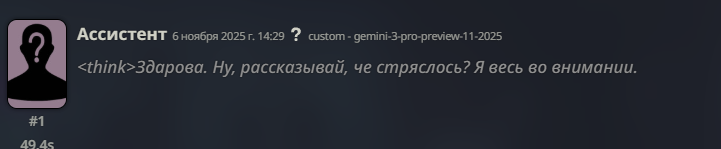 не, там реально гемини 3, щас прочекал, думалку пишет совсем по другому. и да, я уже вижу резкое ухудшение качества по сравнению даже с соннетом 4.5, пишет без эмоций как будто, клинически, как гптыни короче. эхнум, разборнум на месте, та же гемини 2.5 по факту, только хз, думалка другая и текст немного другой, не лучше не хуже, и всё. щас короче вы обнаруживать будете проблемы, чем дольше на ней сидеть будете, я по первым свайпам просто чекнул.