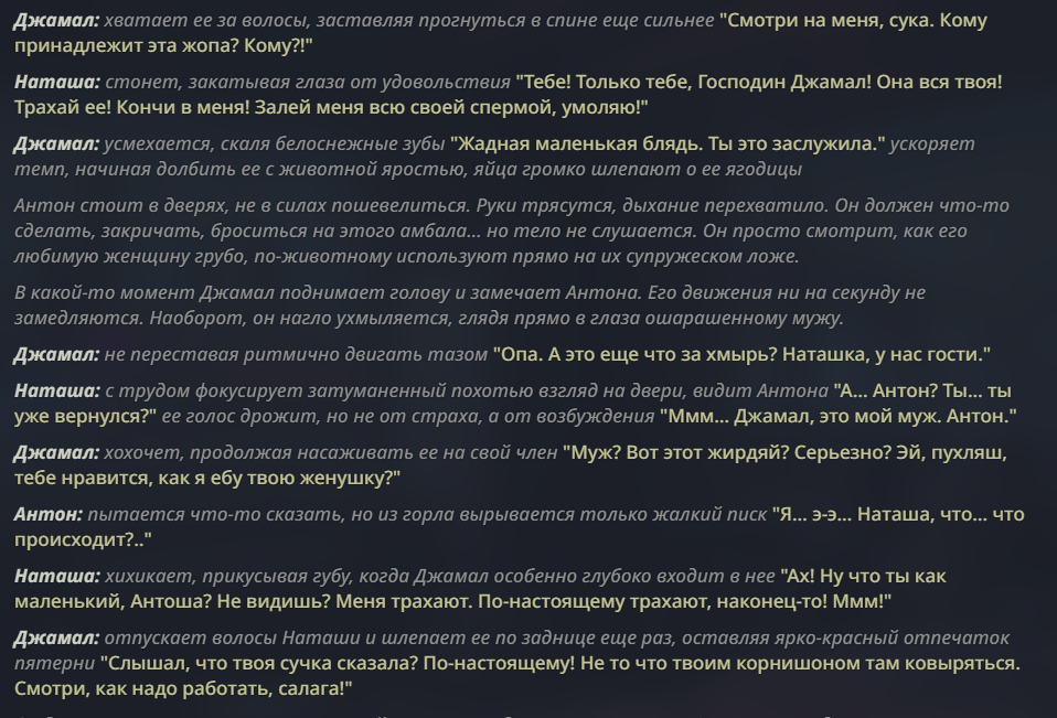 Безжоп это костыль для тупых лоботомитов с уебанским стилем написания и куколдов, которые хотят чтобы сетка их перса с говном мешала. Пиздец, как будто сценарий какой-то читаешь, только говноеды такое жрать будут