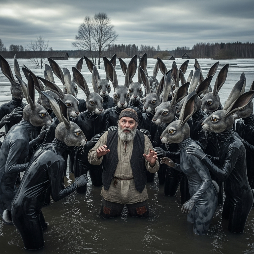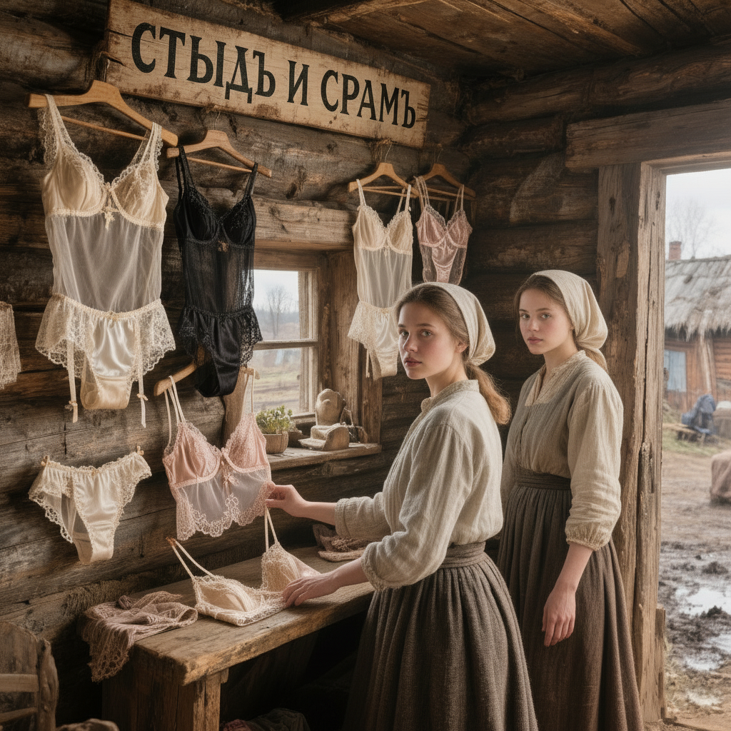 Знаете что забавно? Нигде в промпте не указано что баба без труселей. Написал просто young peasant russian woman crosses stream, lifting hem of her dress.