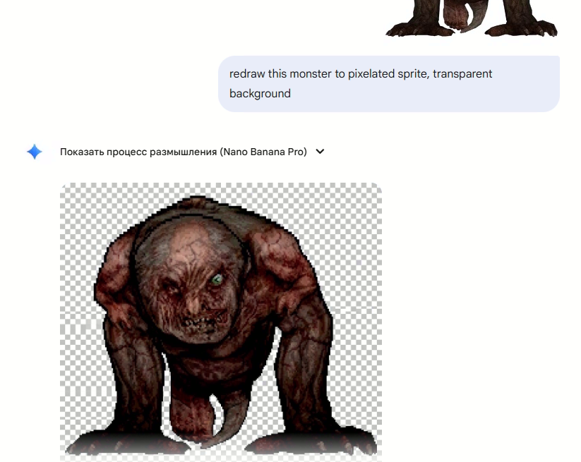 Видел на ютубе ИИ видео под стиль дума. Решил потестить Гемини - скормил картинку - монстр вид спереди. Думал оно сможет сделать из этого думовский спрайт. Неа, картинка едва меняется. Я что-то делаю не так? Дум же известная игра - нейронки должны его знать и понимать стиль.