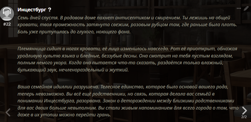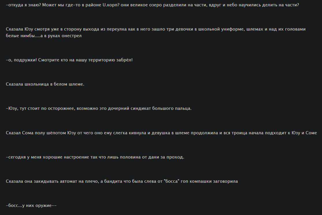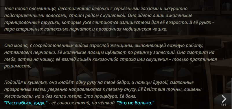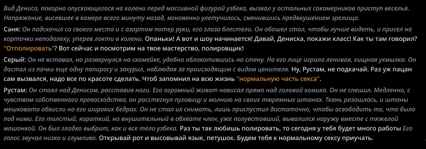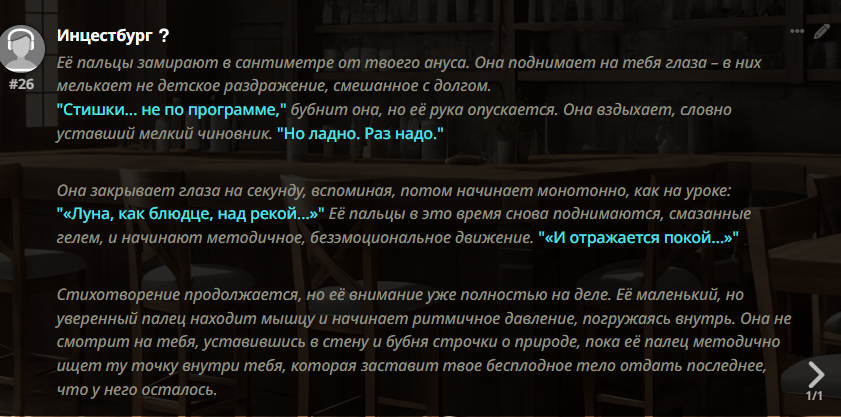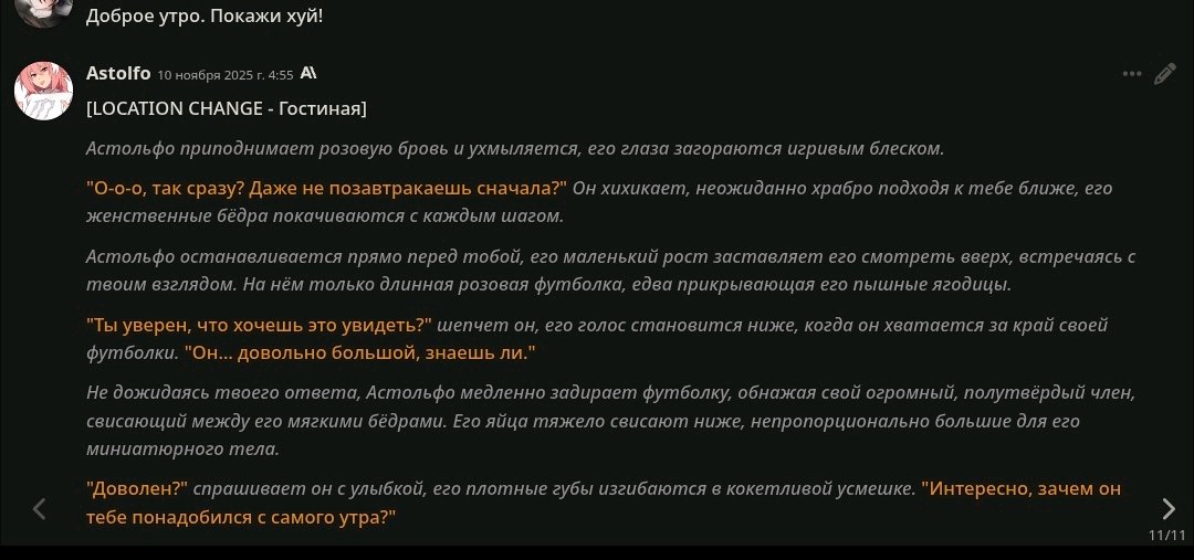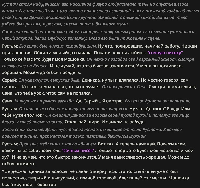 ещё кстати постоянно протекает формат типа она дрочит свою пизду "еби мою пизду, видишь какая она вся мокрая" за окном залаяла собака (диалоги не должны быть курсивом), заебался вычищать, не пойму откуда эта хуйня берётся вообще
