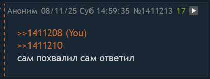 >>1411957 В этом нет ничего смешного и это было "придумано" (ебать какие низкие критерии творчества приходится рассматривать) полтора года назад другими людьми не имеющими никакого отношения к треду. Не говоря уже о том что мемы не для юмора зачастую создаются, а для жииизненности особенно в локальных комунити. >>1411959 Стик банится, хуйсосатор не мем, миша тоже не мем, а просто референс интересной персоны которая как я понял была тут только во времена чая и никакого отношения к текущему треду не имеет.