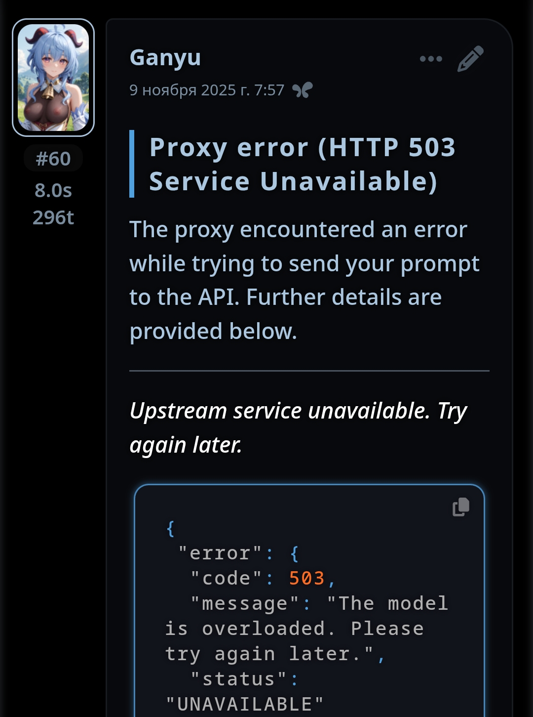Gemini отупел И я прочувствовала это на себе: сначала играла на Английском и он наотрез отказывался писать нужным стилем, а потом переключилась на русский и стало совсем плохо. Про 503 через каждые пять минут даже вспоминать не хочется.