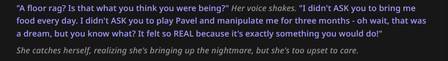 >>1411522 Она второй раз начала то же самое писать? Диалоги каловые, если честно, безжизненные какие-то, но, может, тут чатхистори от Гемини виновата. Ну и >он он он