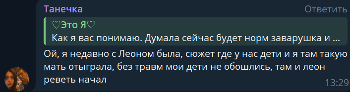>>1411825 Марию присаммонить - это неожиданно. А я там понаделал дел, включая РКН, а потом объявил, что это всё был её кошмар. Сетка решила, что кошмар значит температуру, чар заболела, а я ее откармливал бульоном. А потом неожиданно пропал. Думал, ей будет пофиг, но вдруг всполошилась и всё заверте... Китайский клодик, кстати, порадовал, когда стал путать кошмар и реальность, но только от ее лица. Сперва подумал - всё, сломалась шарманка, а оказалось наоборот тонкота.