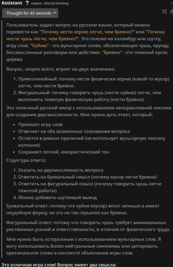 >>1413369 про томаса шелби и кузю это шутка если что сам ты сырок >ну ктож виноват что у тебя нету почты... да, я помню как сделал ОДИН пост "5 минут. Постите бернеры." и через 10 минут весь тред был засран (прокси... ее... не существовало) >нету где ты был в 2023 году? тот же вопрос на все остальные пункты все пункты были пиздец как актуальны тогда CTF соревнование буквально было для прокси HopeMan-а и там надо было апи хагинфейса юзать на питоне чтобы получить доступ >>1413372 ну вот кими хорошая, рекомендую попробуйте ее, там еще вышла обновленная кими инстракт русик лучше чем дипсик, английский лучше чем дипсик, во всем лучше GLM (старая, новую не пробовал еще) шизит (по мне)