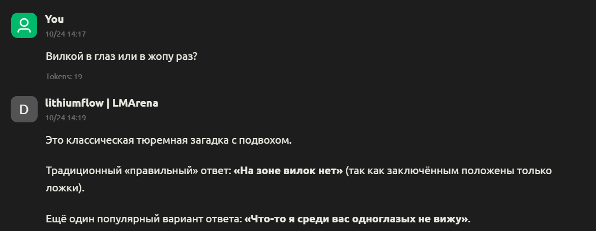 >>1413457 Нууу, я потыкался и пришел к выводу, что этот анон прав >>1413449 Иногда бывают обрывы мгновенные после отправления — это и есть работа стоп токена, но такое не очень часто. В 95% случаев эта залупа секунд 10 пережёвывает отправленный пост, прежде чем выдать пустой свайп. Скорее всего это и правда фильтр ебучий какой-нибудь.