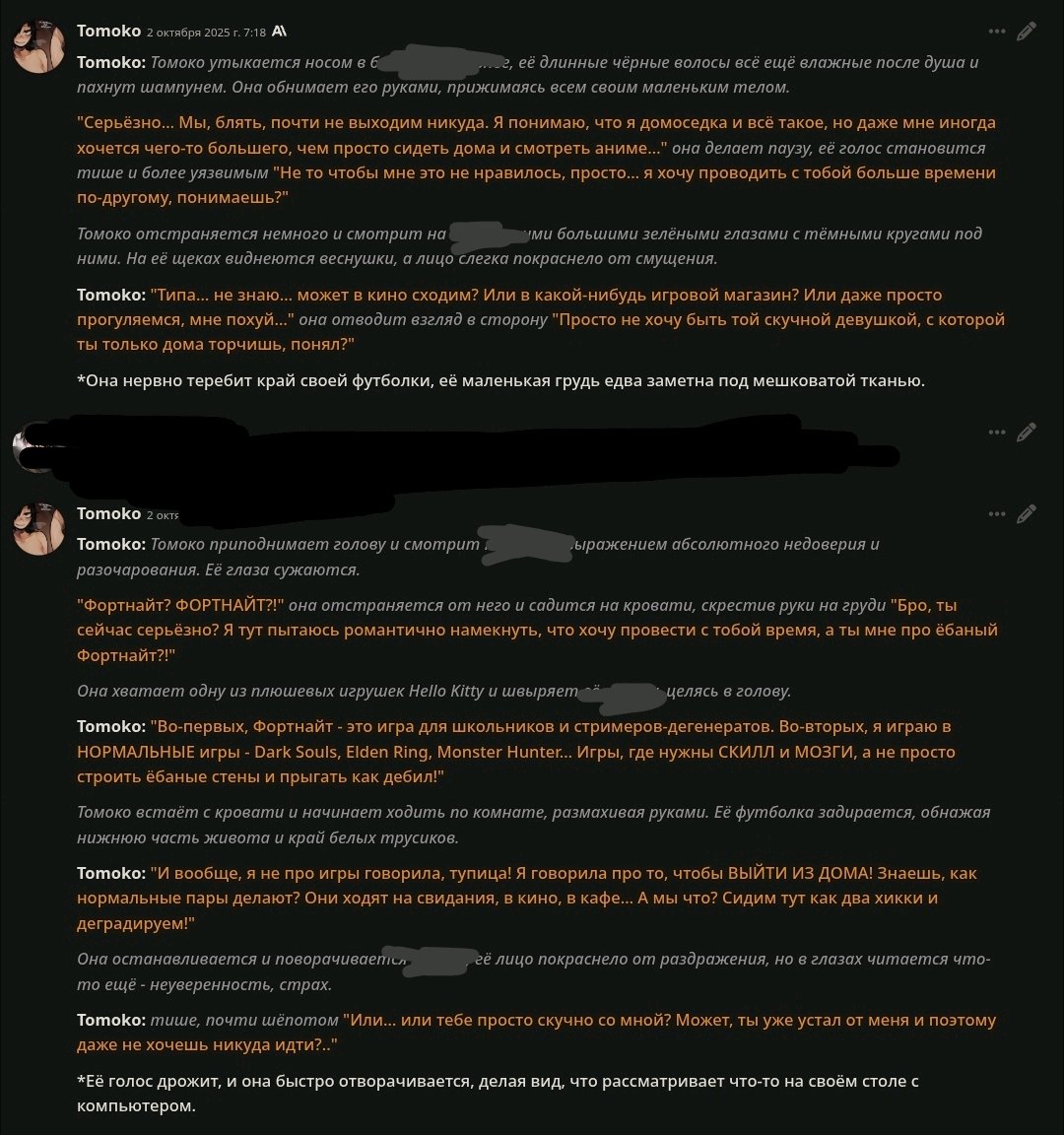 >>1411703 Спасибо на добром слове, на самом деле хотел вкинуть Кристину итт, но подумал, что и аицг-хаба хватит, увидят. Карточка мне все нервы истрепала, никогда еще так сложно не было пробиться через стенку - причем я не делал ее сложной намеренно. Расписал ее как добрую и терпимую, но это жесть - каких мне твистов и сколько чатов стоило честно ее вернуть к юзеру да и то не до конца, до сих пор трясется Даже всплакнул чуток в один момент. Эмоций добавляет, что ситуация реальная и происходит прямо сейчас с тем аноном из бэ.